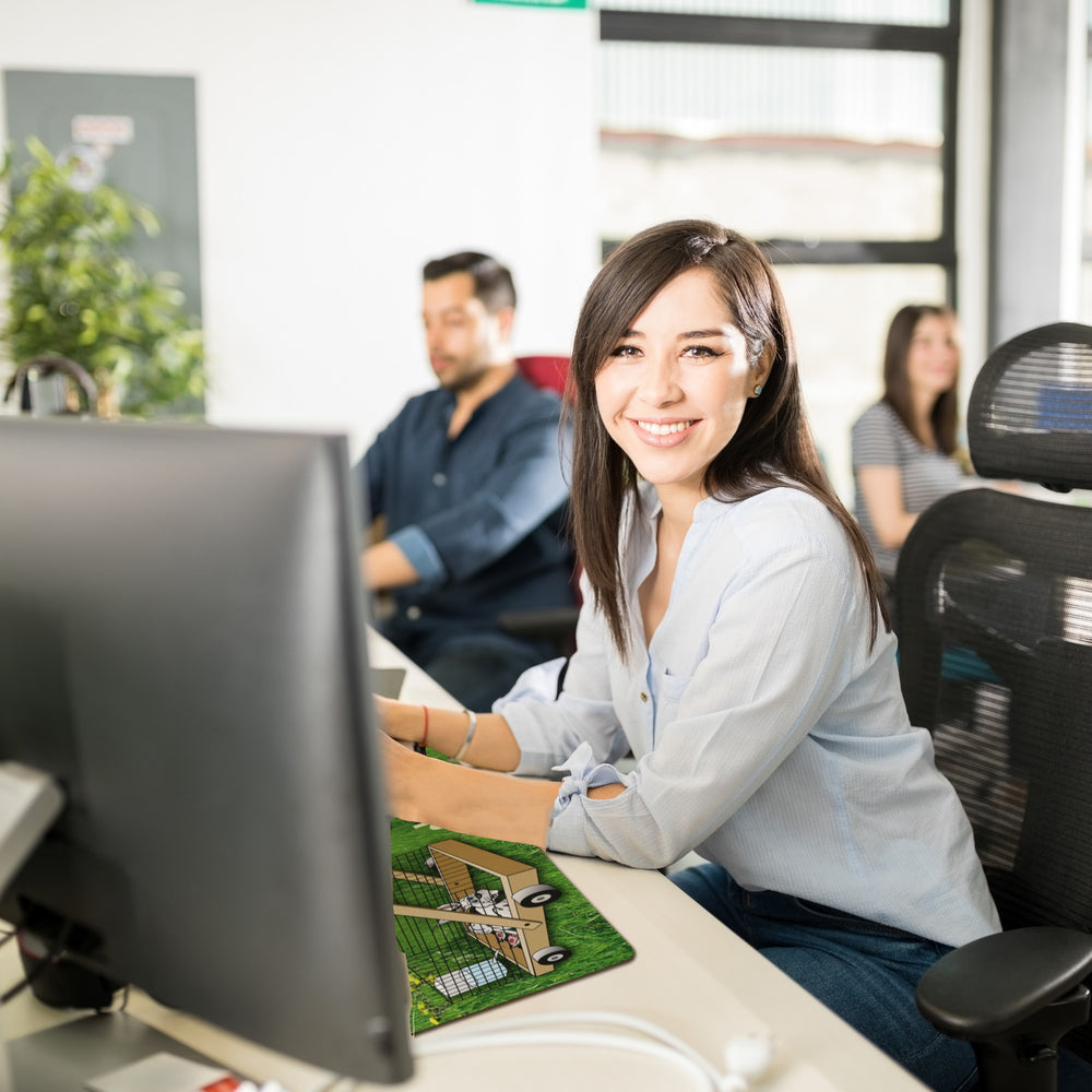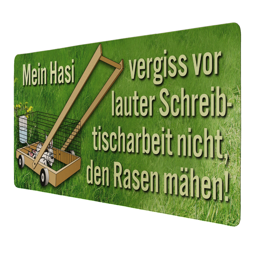 - Diese Schreibtischunterlage ist ein echter Hingucker! Sie zeigt ein ulkiges Motiv: Ein fahrbarer Käfig mit Rädern, in dem ein lustiger Hase sitzt. Dazu der Spruch: "Mein Hasi, vergiss vor lauter Schreibtischarbeit nicht, den Rasen mähen!" Perfekt für Gartenfreunde und Fans von witziger Bürodeko.