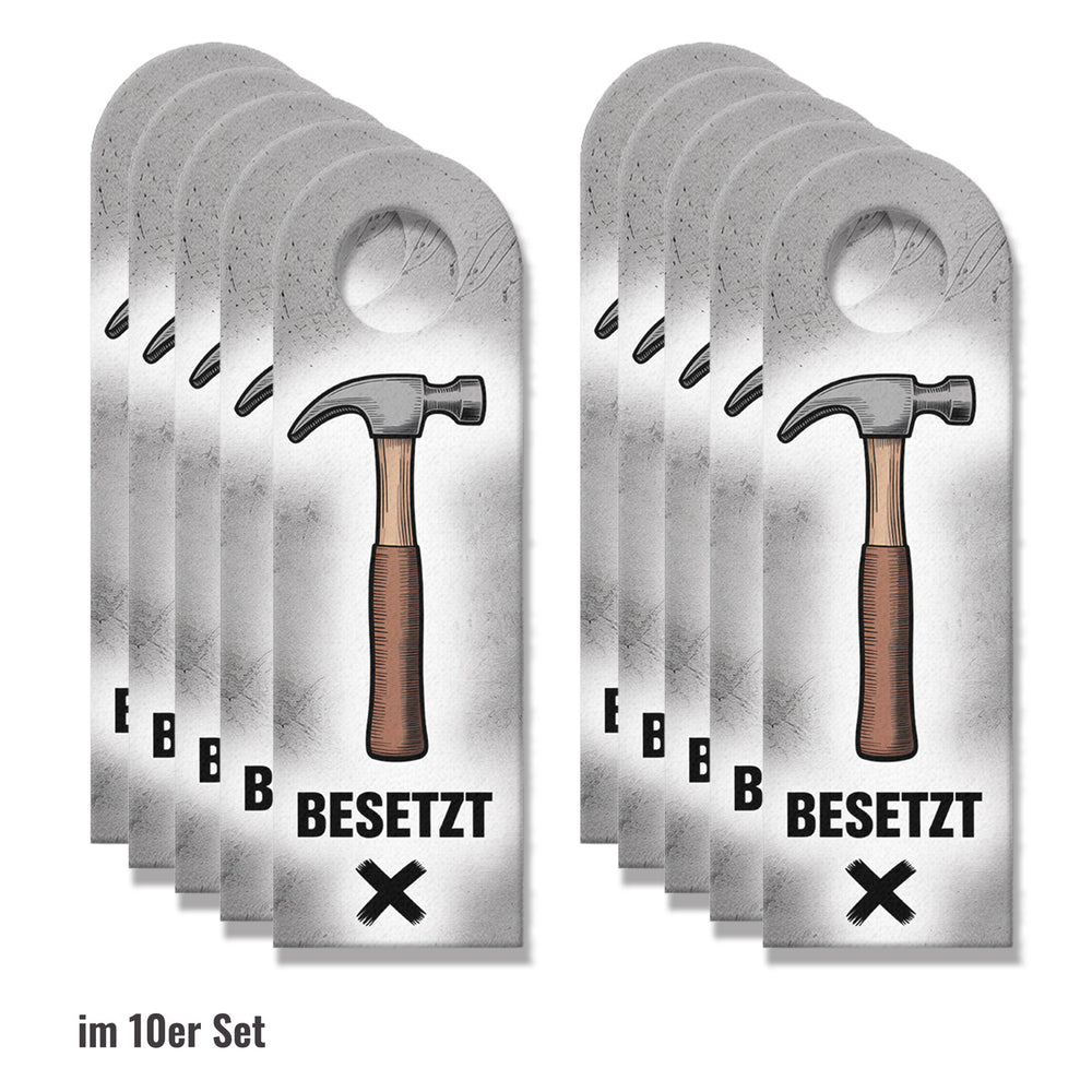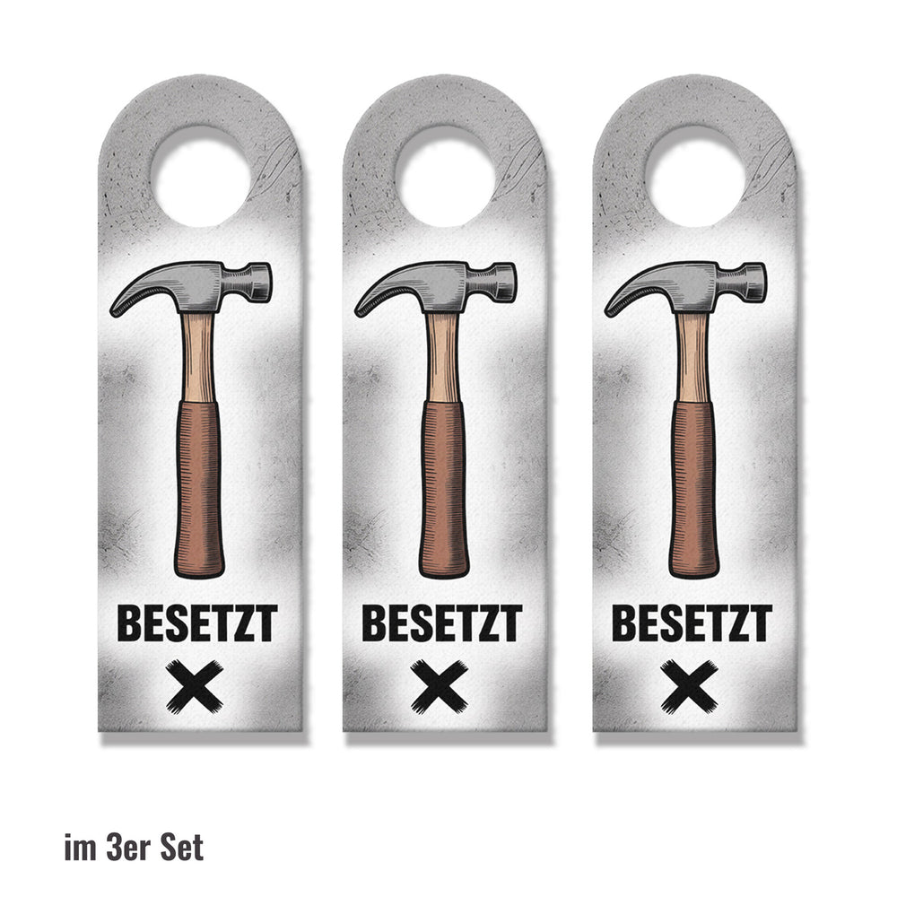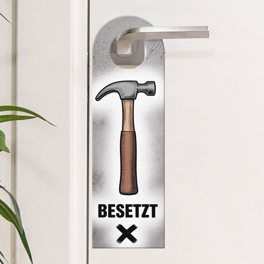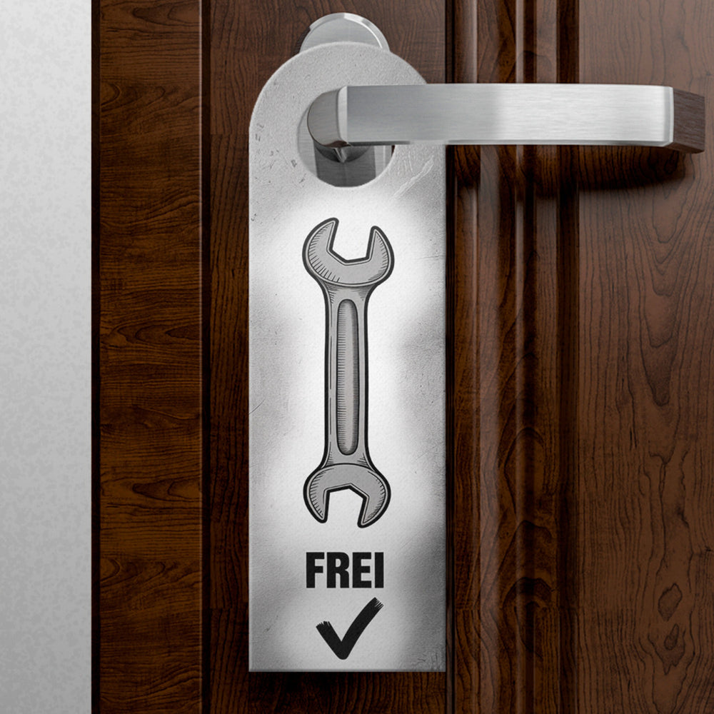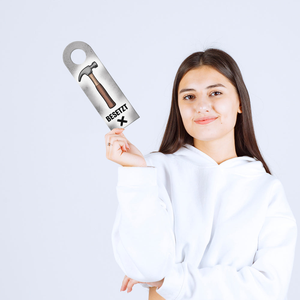 - Dieser Türhänger ist ein kreatives Meisterwerk für Heimwerker: Ein Hammer und ein Schraubenschlüssel auf einem coolen Betonhintergrund. Skizzenhaft, handgezeichnet, mit "BESETZT" und "FREI" in fetten Buchstaben. Perfekt für alle, die klare Ansagen lieben!