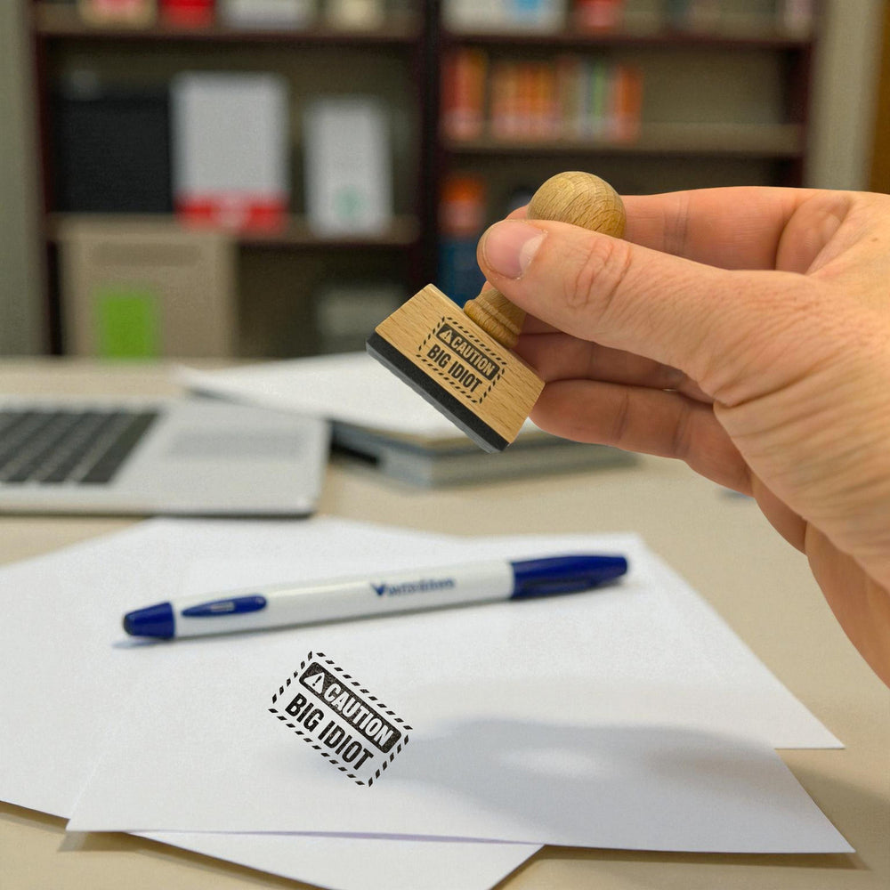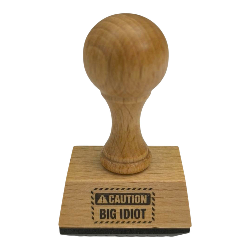 • Der eckige Stempel aus hochwertigem Holz ist mit einem handlichen Griff versehen. Sein Stempelbild zeigt deutlich "CAUTION BIG IDIOT" mit einem auffälligen, gestrichelten Rahmen. Links prangt ein Warn-Dreieck, das Wort "Caution" ist schwarz hinterlegt. Ein Hingucker, der in keinem Bürobedarf fehlen sollte!