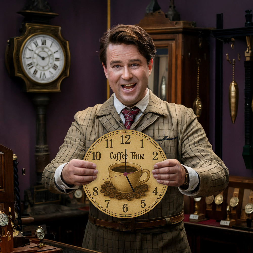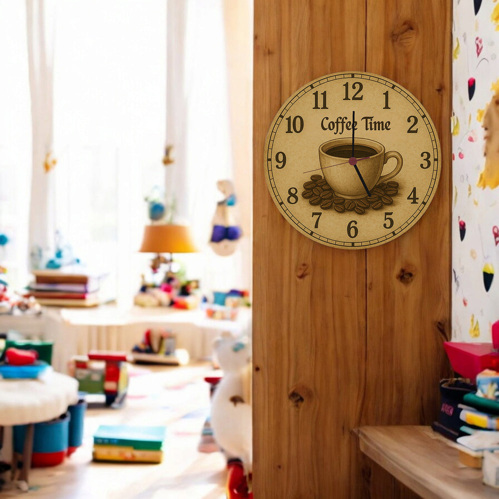 - Entdecke die Coffee Time Wanduhr im charmanten Vintage-Stil! Diese Uhr kombiniert die Schönheit einer klassischen Kaffee-Illustration in Sepiatönen mit einer detaillierten Kaffeetasse und verstreuten Bohnen. Die schwarzen Zahlen und der auffällige „10 COFFEE TIME 2“-Spruch runden das rustikale Design perfekt ab. Ein Must-have für jeden Nostalgie-Liebhaber!