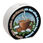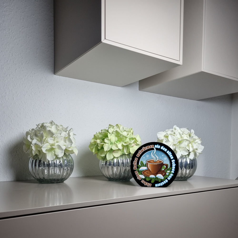 dampfende Kaffeetasse Magnet rund mit Spruch: Kaffee aufwärmen statt alten Schnee