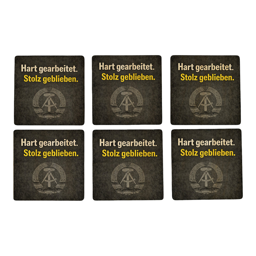 DDR-Stolz 6er Set Untersetzer aus Holz - Hart gearbeitet. Stolz geblieben.