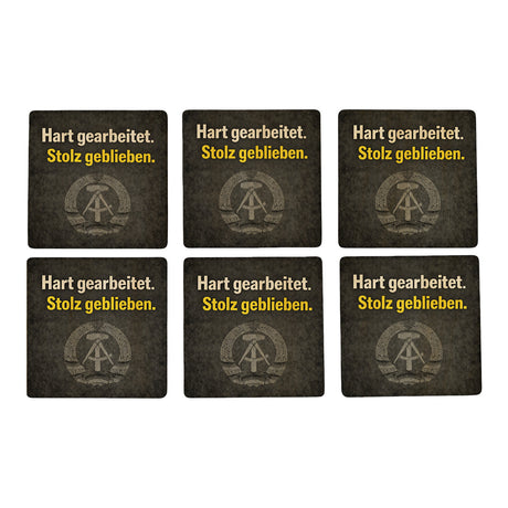 - Entdecken Sie das DDR-Stolz Untersetzer-Set – eine kultige Kombination aus Nostalgie und Funktionalität! Jeder der 6 Untersetzer zeigt das legendäre DDR-Logo als Wasserzeichen auf einem grau-betonfarbenen Hintergrund. Der prägnante Spruch „Hart gearbeitet. Stolz geblieben.“ verleiht jedem Untersetzer Charme und macht sie zum perfekten Gesprächsstarter.