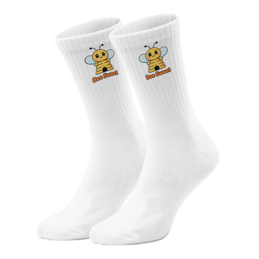 - Die epicsocks Bee Adventures sind weiße, knöchelhohe Socken, die mit einem niedlichen Cartoon-Bienenmotiv und dem witzigen Spruch "Bee Sweet" bedruckt sind. Der Schaft der Socken setzt mit seinem thematischen Akzent ein fröhliches Statement, das deine Füße in den Mittelpunkt jeder Unterhaltung rückt!