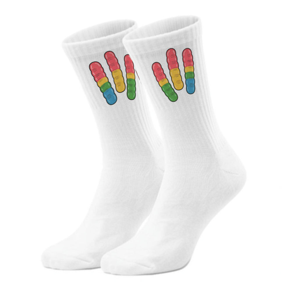 - Die epicsocks Candy Delight Gummiwürmer Socken sind ein echtes Highlight! Mit ihrem farbenfrohen Wurmmotiv und dem süßen Spruch bringen sie Spaß und Freude in jeden Kleiderschrank. Die bunten Tennissocken sind aus einer hochwertigen Mischung aus Baumwolle und Polyester gefertigt und garantieren Komfort und einen tollen Sitz.
