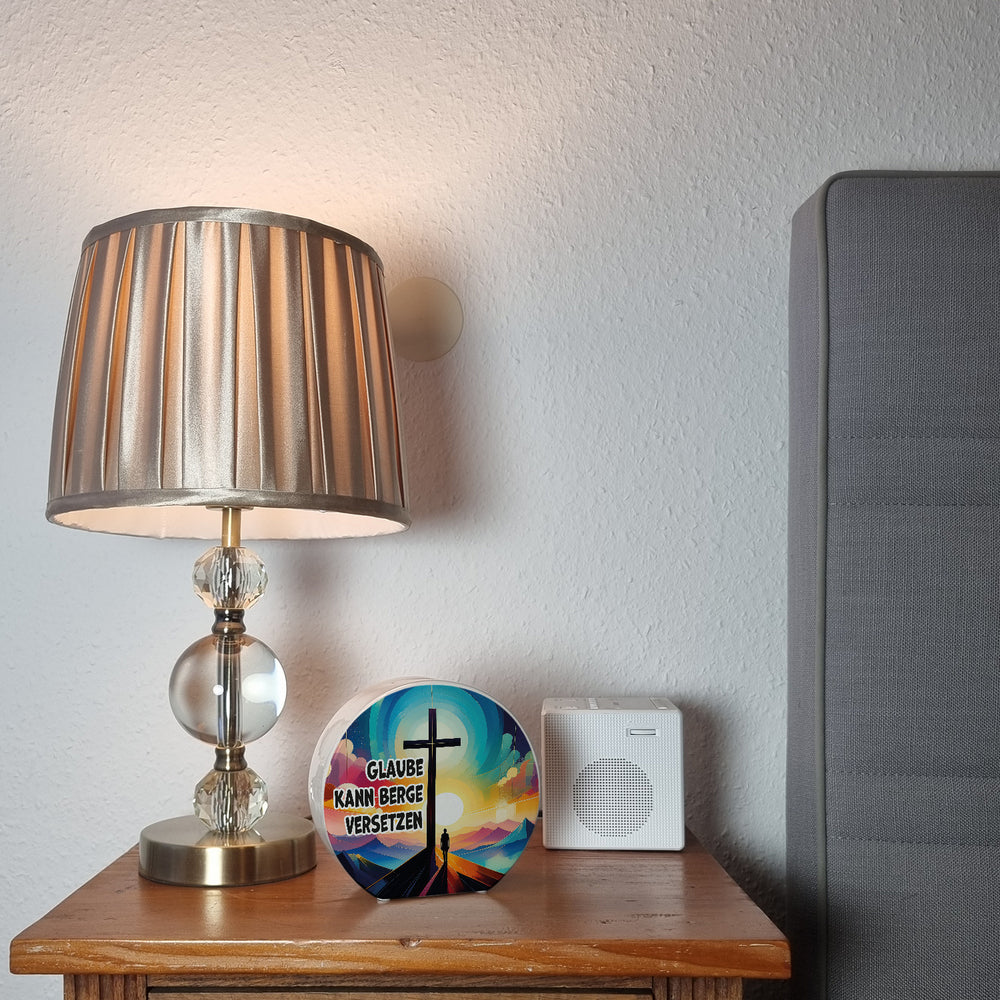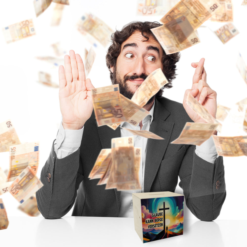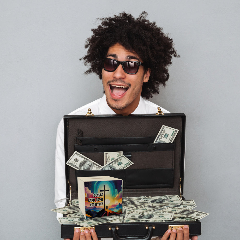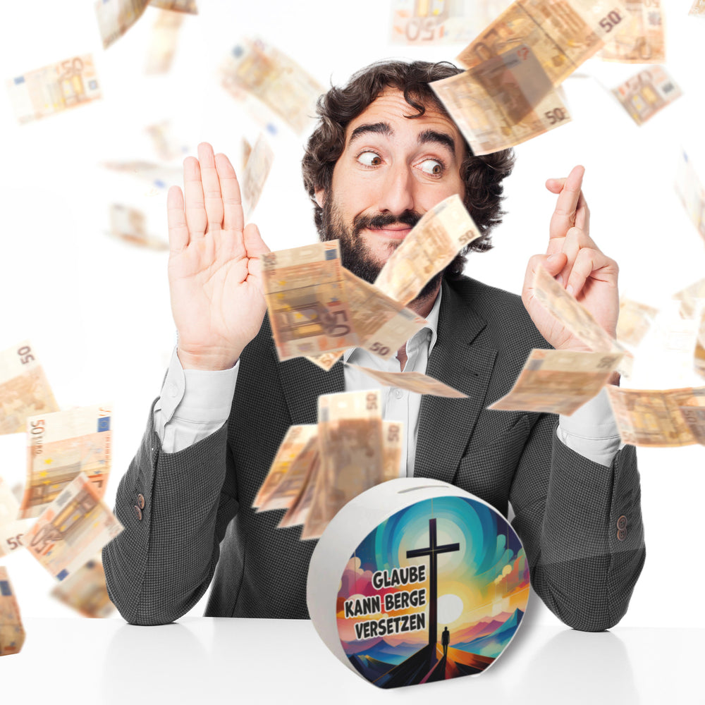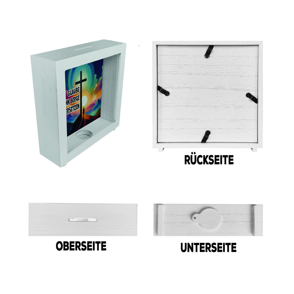 - Die Gipfelkreuz Spardose zeigt eine bunte Berglandschaft mit einem Menschen, der vor einem Kreuz steht. Der Spruch "Glaube kann Berge versetzen" ziert das Motiv in nostalgischem Stil. Ihre einzigartige Gestaltung zieht alle Blicke auf sich und ist eine perfekte Kombination aus Religion und Bergidylle.