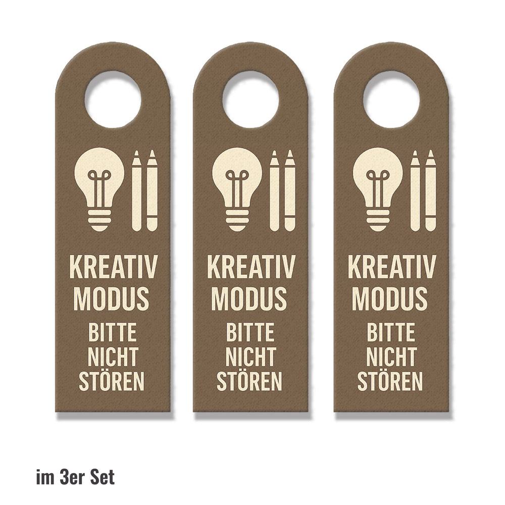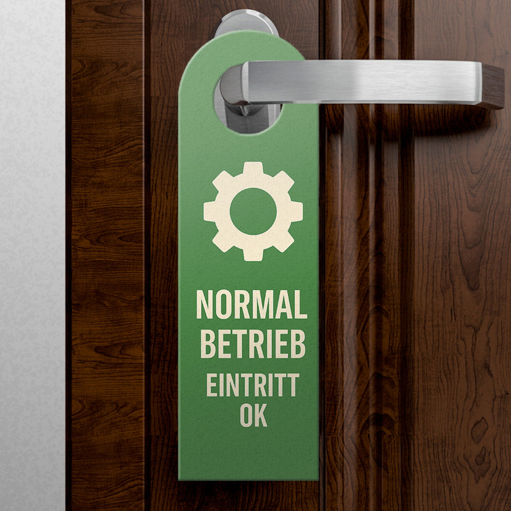 - Der Türhänger besticht durch sein kreatives Design mit einem Glühbirnen- und Zahnradsymbol. Links in Braun kündigt er den "KREATIV-MODUS" an, rechts in Grün den "NORMAL-BETRIEB". Die Symbole und Farben machen das Produkt nicht nur praktisch, sondern auch optisch ansprechend und leicht verständlich.