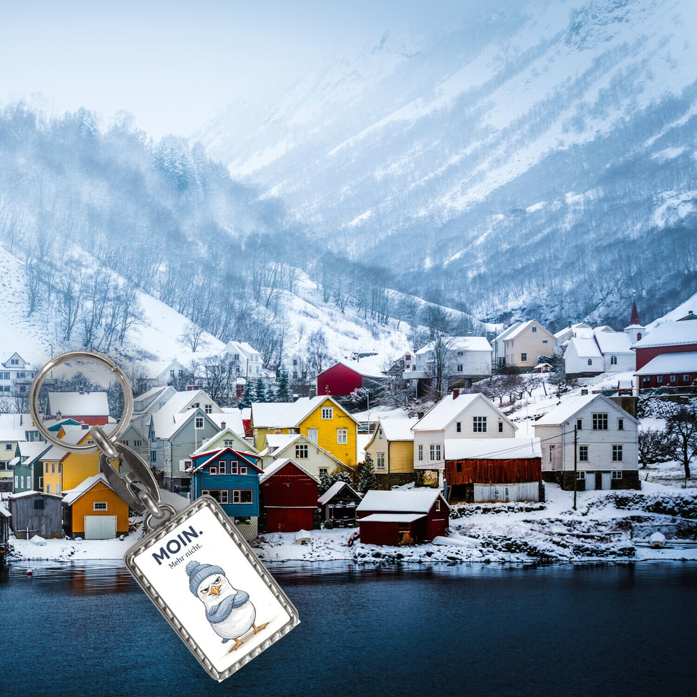 - Der Schlüsselanhänger zeigt Manfred, die mürrische Möwe, in einem pummeligen Cartoon-Stil. Mit Wintermantel und farblich passender Mütze in Hellblau, einem gelben Schnabel und orangefarbenen Füßen, bringt dieser charmante Vogel mit verschränkten Flügeln und einem humorvollen "MOIN. Mehr nicht." Spruch maritimen Spaß in den Alltag!