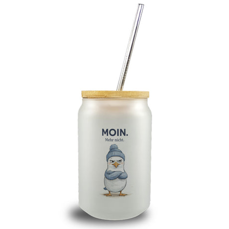 Manfred die Möwe Moin mehr nicht Trinkglas mit Bambusdeckel für Küstenfans
