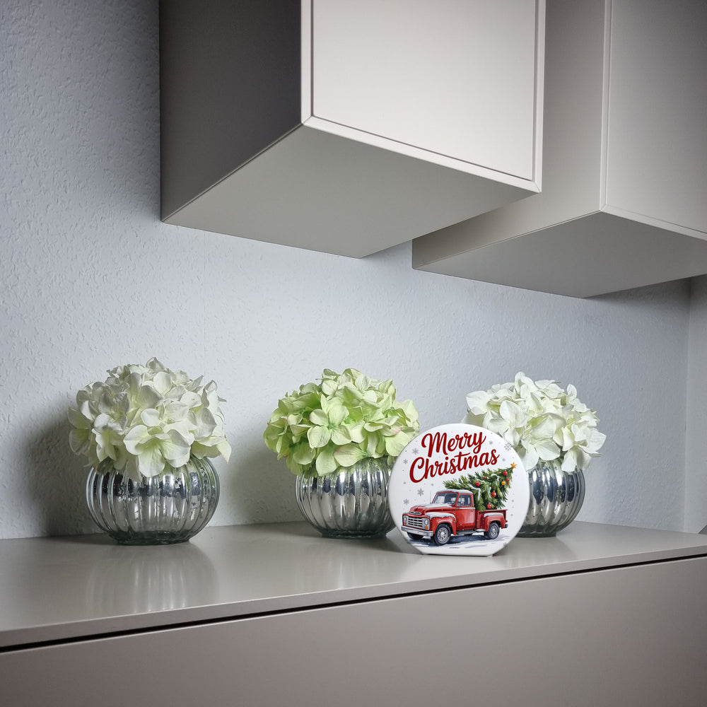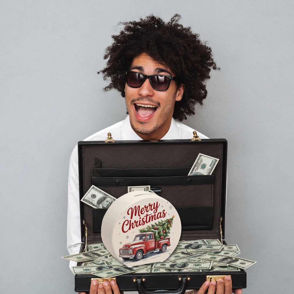 • Unsere "Merry Christmas" Spardose begeistert mit ihrem festlichen Retro-Design: Ein roter Pickup-Truck, der einen reich geschmückten Weihnachtsbaum transportiert. Mit Chromakzenten und Schneeflocken-Hintergrund versprüht sie nostalgischen Charme und moderne Eleganz. Der Schriftzug "Merry Christmas" rundet das Design ab und bringt Weihnachtsstimmung ins Zuhause.