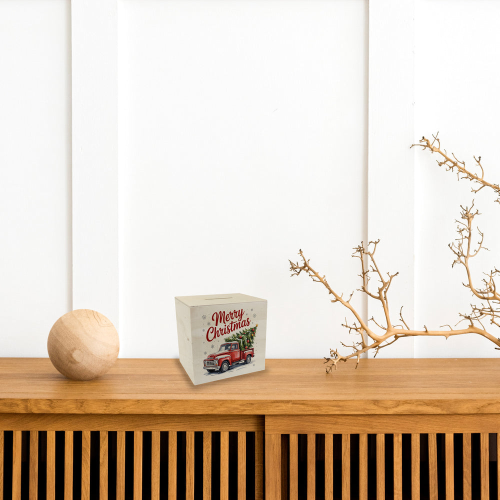 • 1x Merry Christmas Spardose mit Rotem Truck und Weihnachtsbaum in der gewählten Ausführung