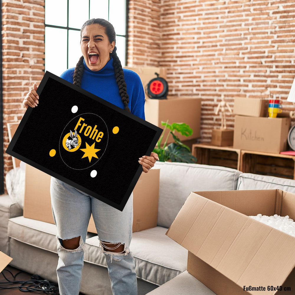 - Die Osterhase Fußmatte ist ein echter Hingucker! Mit ihrem großen O, aus dem ein lustiger Hase hervorlugt, und einem funkelnden Stern, bringt sie Frische ins Osterfest. Der fröhliche Spruch "Frohe Ostern" rundet das Design perfekt ab und sorgt für ein herzhaftes Willkommen.