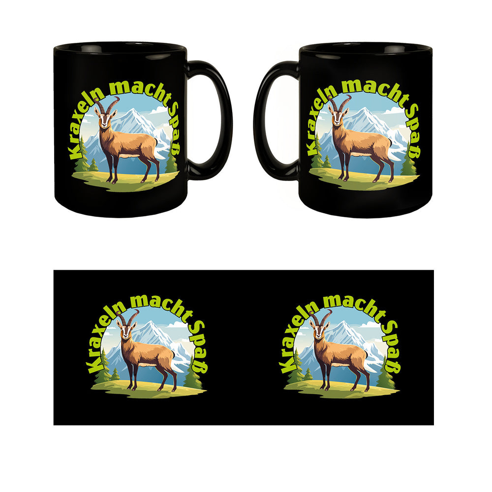 Steinbock Tasse in Schwarz mit Spruch: Kraxeln macht Spass