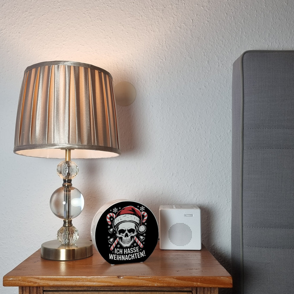 - Die Totenkopf Weihnachtsmann Spardose zeigt ein freches Design: Ein schwarz-weißer Schädel mit roten Zuckerstangen und einer Weihnachtsmütze. Die hohlen Augen und das schelmische Grinsen sind perfekt für alle, die Weihnachten etwas anders sehen. Der Schriftzug "Ich hasse Weihnachten!" verleiht der Spardose einen lustigen, rebellischen Touch.