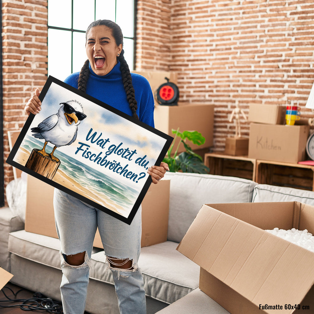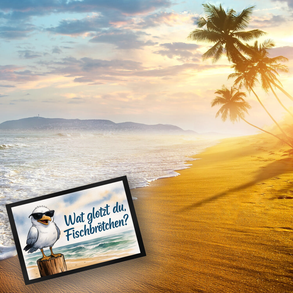 - Diese lustige Fußmatte zeigt eine stylische Möwe mit Sonnenbrille, die chillig auf einem Holzpfosten am Strand posiert. Mit ihrem fröhlichen, offenen Schnabel und dem frechen Spruch "Wat glotzt du, Fischbrötchen?" bringt sie maritimen Flair in jedes Zuhause. Die Aquarell-Illustration versprüht Urlaubsstimmung, mit Wellen, Sand und einem Himmel voller Wolken.
