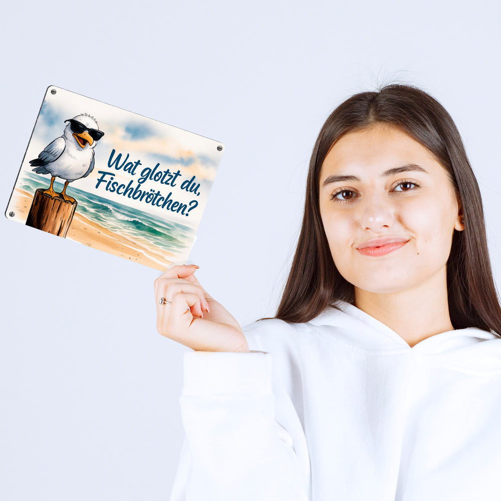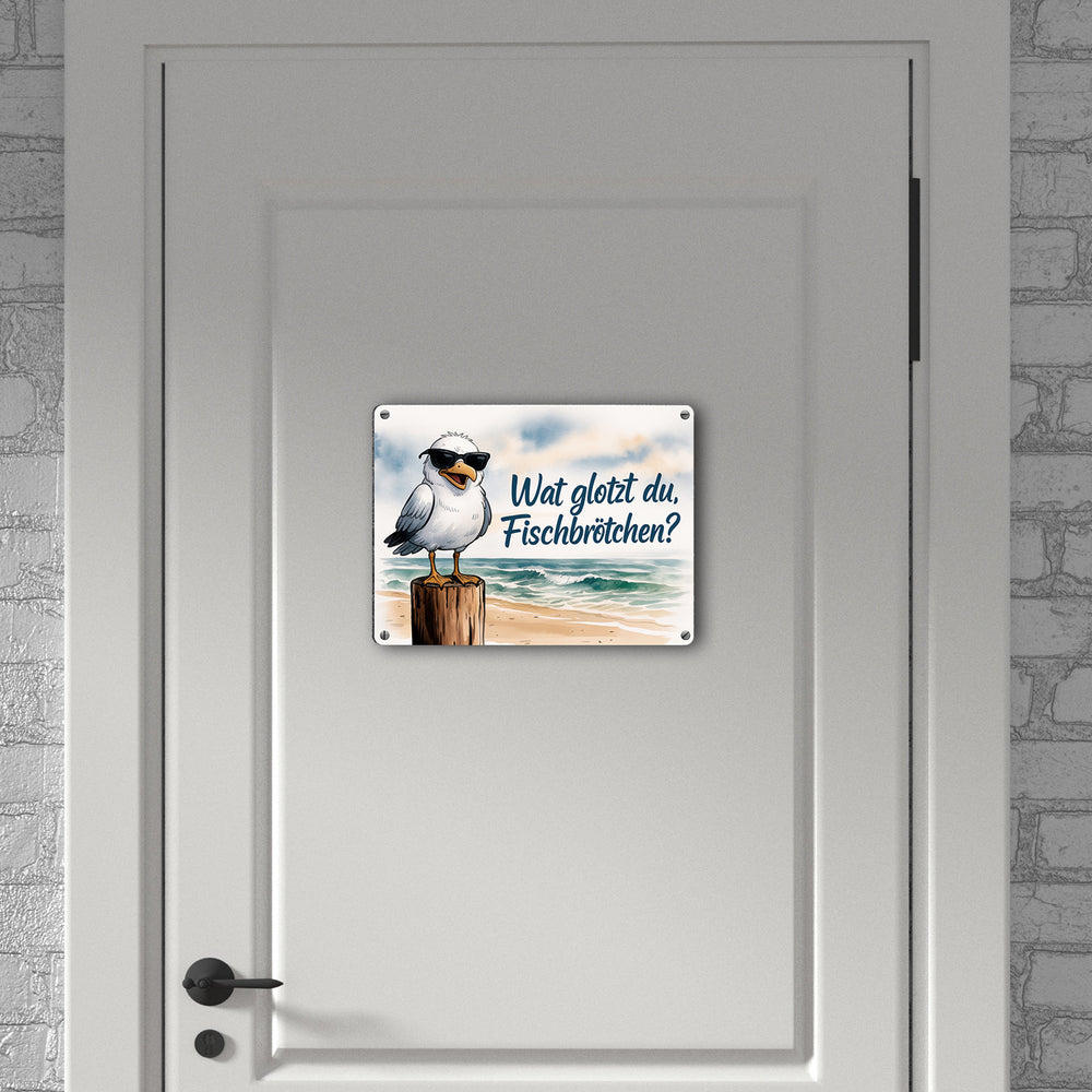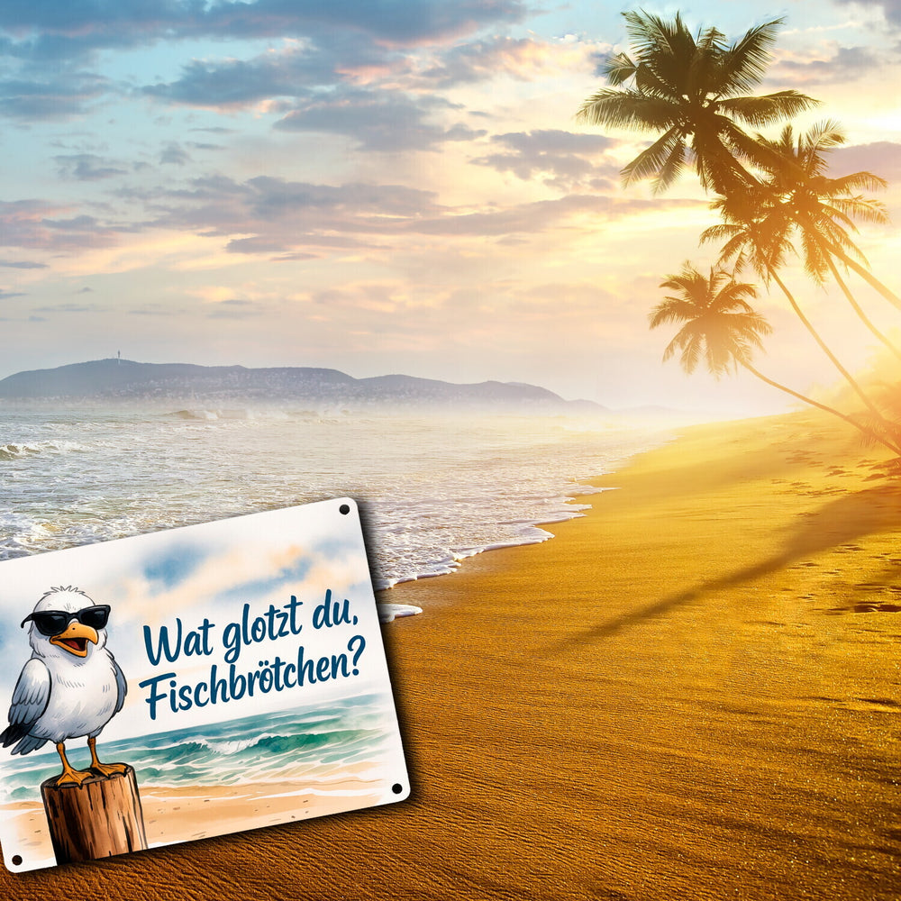 - Erlebe den Sommer mit diesem witzigen Metallschild! Unsere Aquarell-Illustration zeigt eine Möwe in cooler Sonnenbrille, die lässig auf einem Holzpfosten steht. Der fröhliche Vogel grüßt mit dem Spruch: "Wat glotzt du, Fischbrötchen?" Die Strandlandschaft versprüht Urlaubsstimmung mit türkisen Wellen und sanften Himmelsfarben.