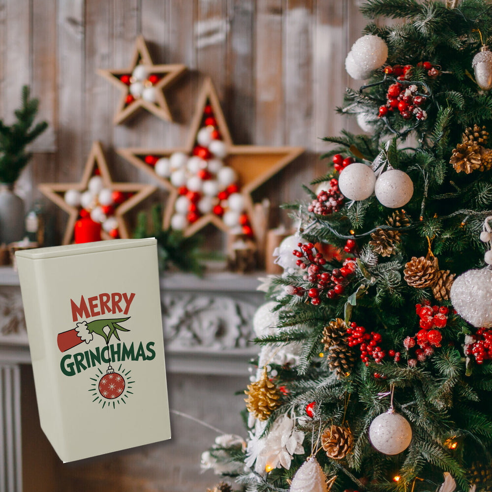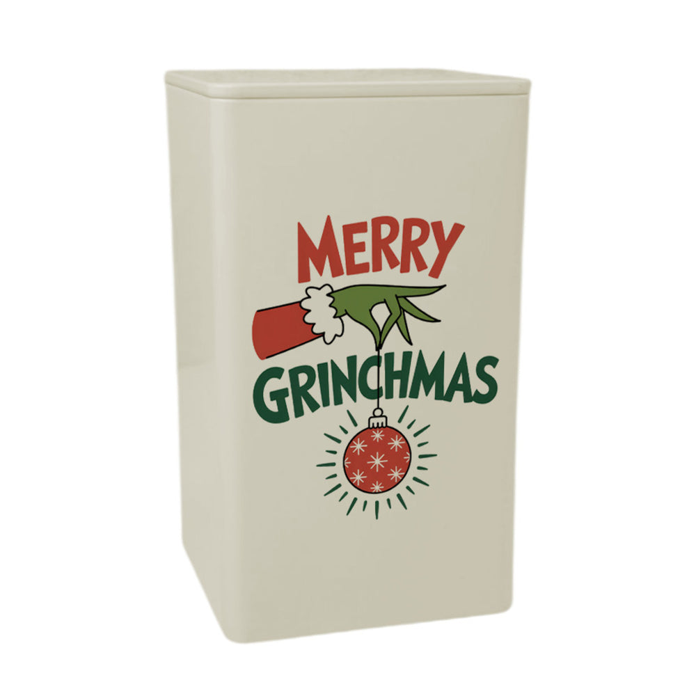 - Diese lustige Metalldose zeigt das kultige Grinch-Motiv in weihnachtlichen Farben. Die grüne Hand des Weihnachtsmuffels mit weißem Pelz hält einen Vogel und eine rote Kugel ziert den unteren Rand. Das Design strahlt nostalgische Retro-Charme auf einem cremefarbenen Hintergrund aus. Ein echter Hingucker mit dem Spruch: MERRY GRINCHMAS!