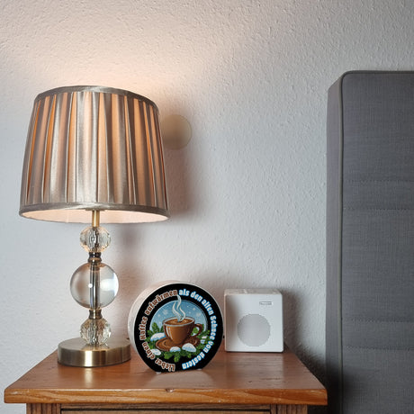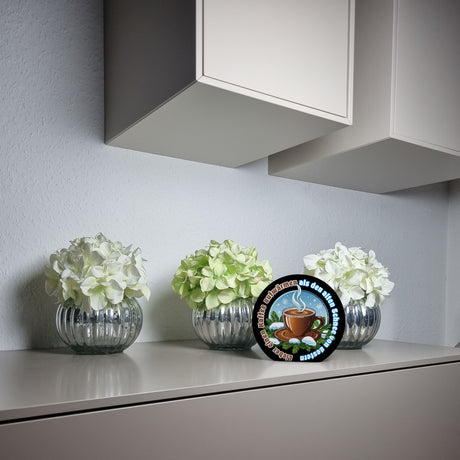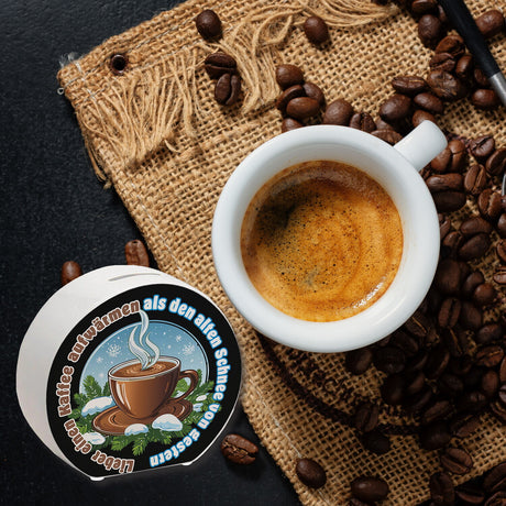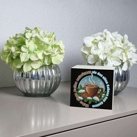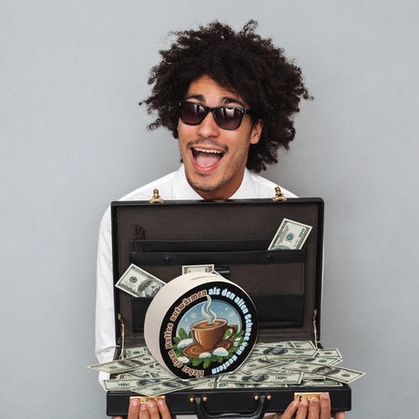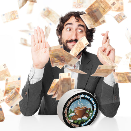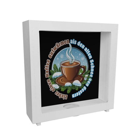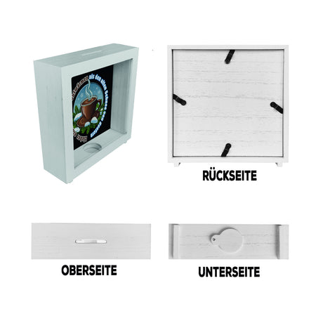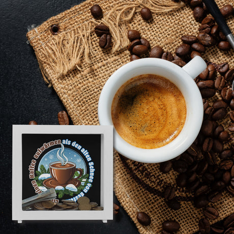dampfende Kaffeetasse Spardose mit Spruch: Kaffee aufwärmen, statt Schnee gestern