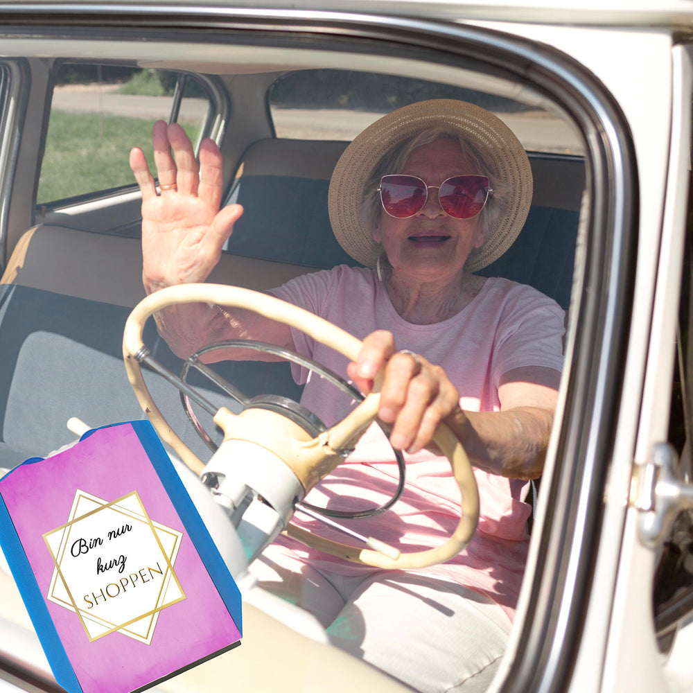 - Lieferumfang: 1x Bin nur kurz shoppen Parkscheibe mit Goldrahmen mit 2 Einkaufswagenchips