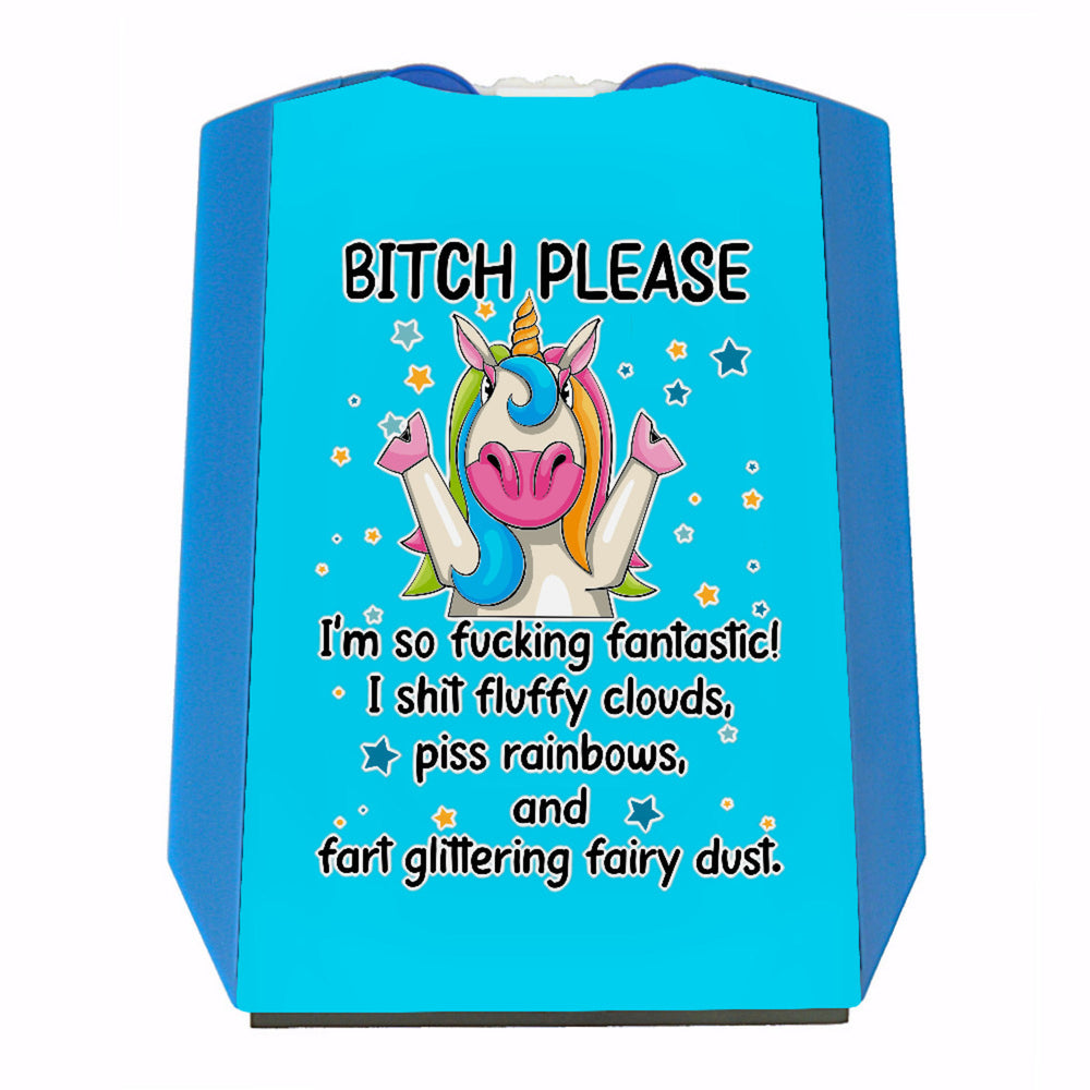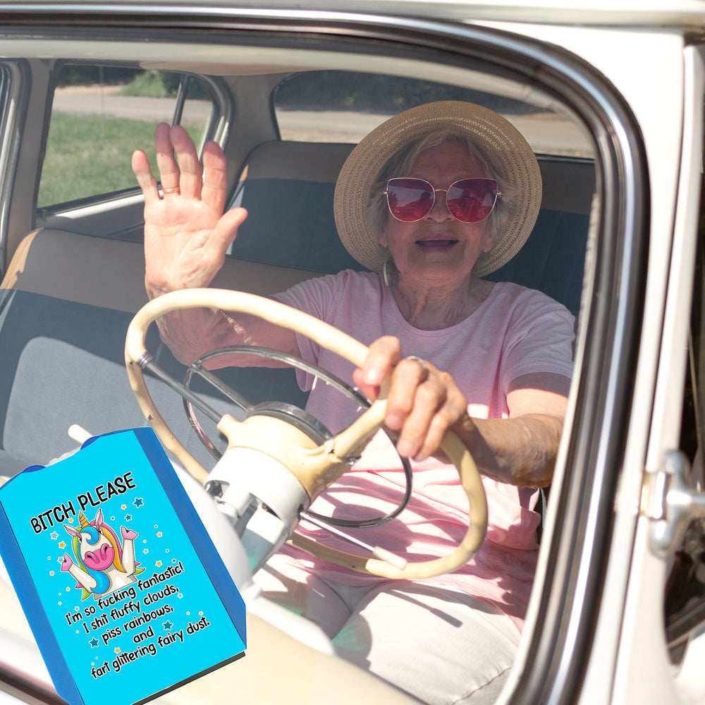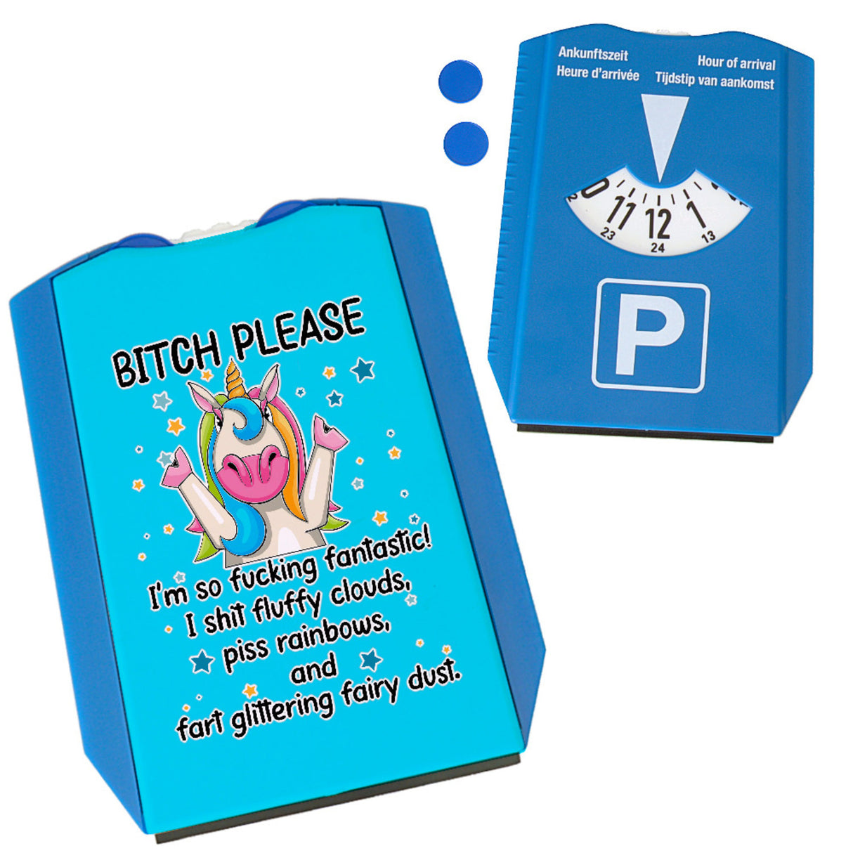 - Mit der witzigen Parkscheibe mit Einhorn Motiv kann man sein Auto ganz einfach und stilvoll dekorieren. Der Spruch Bitch Please sorgt für einen unterhaltsamen Blickfang im Straßenbild.