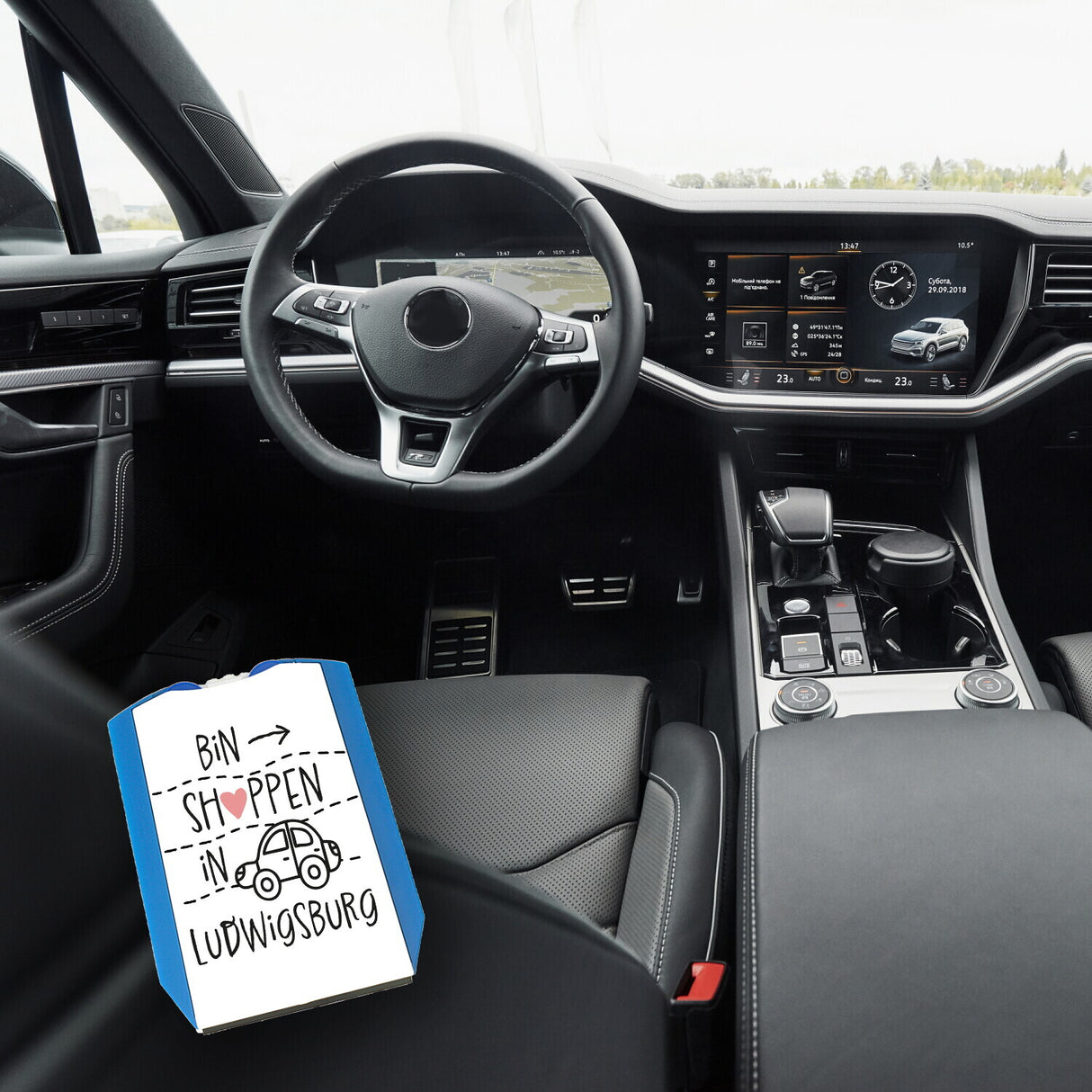 - Diese Parkscheibe ist ein echter Hingucker! Sie kommt mit einem verspielten Motiv daher: Auf weißem Hintergrund prangt der Spruch "BIN SHOPPEN in LUDWIGSBURG". Ein Auto mit Herzsymbol sorgt für eine humorvolle Note. Der rechteckige Stil wird durch klare Linien betont, die das Auto in Szene setzen.