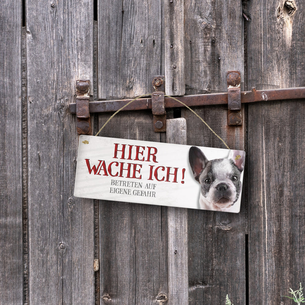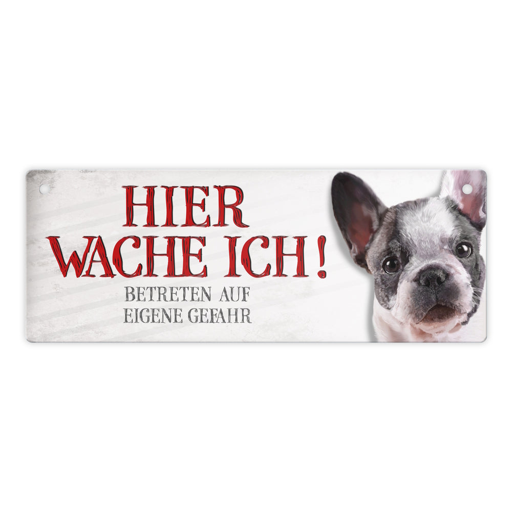 Das Metallschild mit Französischer Bulldogge Motiv und dem Spruch Betreten auf eigene Gefahr - Hier wache ich! ist ein absolutes Muss für alle, die ihre Wohnung, Haustür oder Einfahrt schützen möchten. Dieses Schild ist hochwertig hergestellt und bietet eine langlebige Optik. Es ist in den Größen 7,5x20 cm und 10,5x28 cm erhältlich und kann mit doppelseitigem Klebeband, Schrauben, Nägeln oder einer Schnur zum Aufhängen befestigt werden. Mit seinem witzigen Spruch und liebevoll gestaltetem Motiv ist es ein besonderes Accessoire für jede Tür oder Einfahrt. So sorgen Sie nicht nur für mehr Sicherheit, sondern auch für viel Humor!