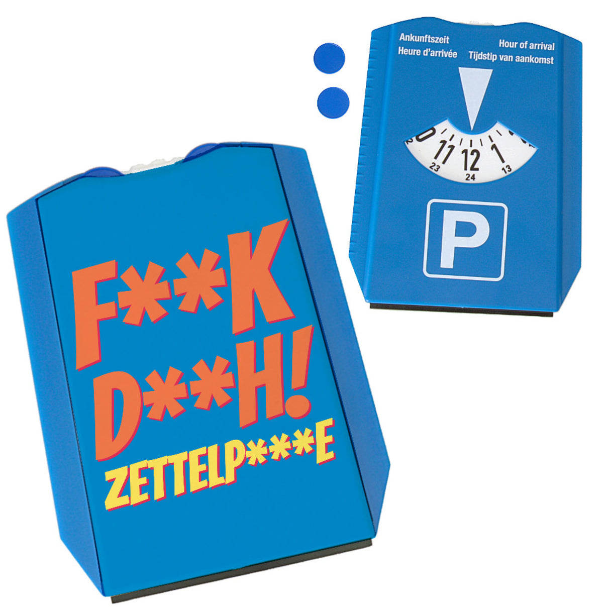 Parkscheibe mit Spruch: F**k D**h! Zettelp***e mit 2 Einkaufswagenchips