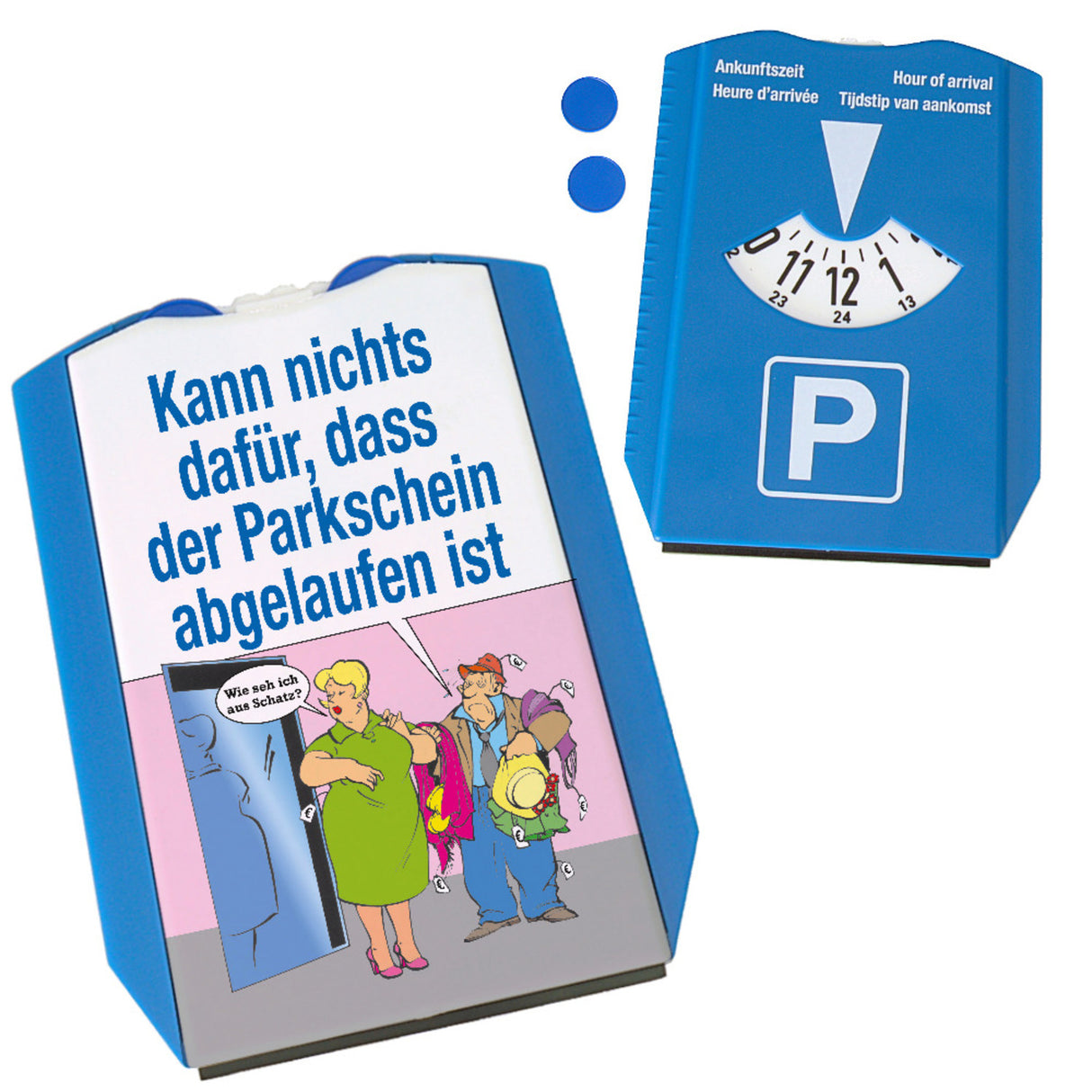 • Diese ulkige Parkscheibe bringt Lachen auf den Parkplatz! Sie zeigt ein im Comicstil gezeichnetes Paar – die Frau prüft ihr Aussehen, während der Mann mit Einkaufstüten kämpft. Der humorvolle Spruch "Wie seh ich aus Schatz? Kann nichts dafür, dass der Parkschein abgelaufen ist." macht sie zum perfekten Hingucker.