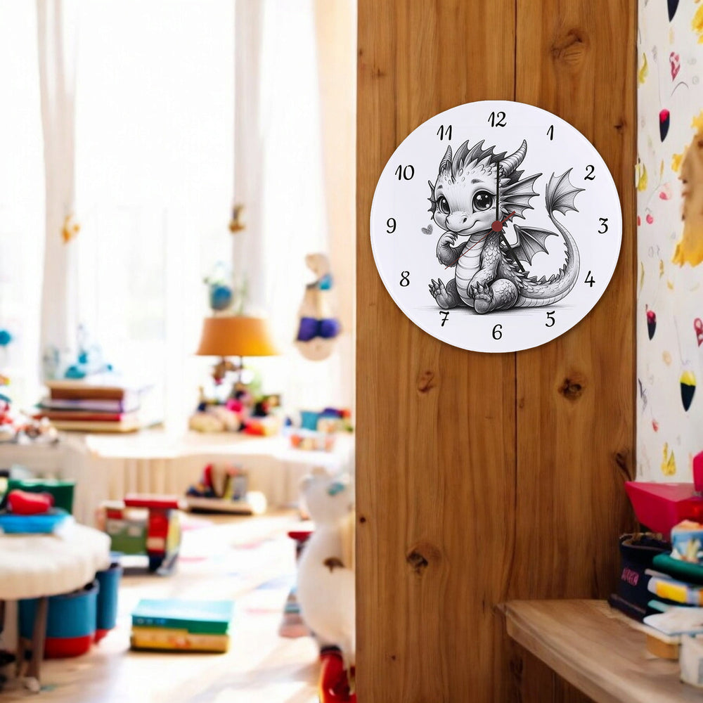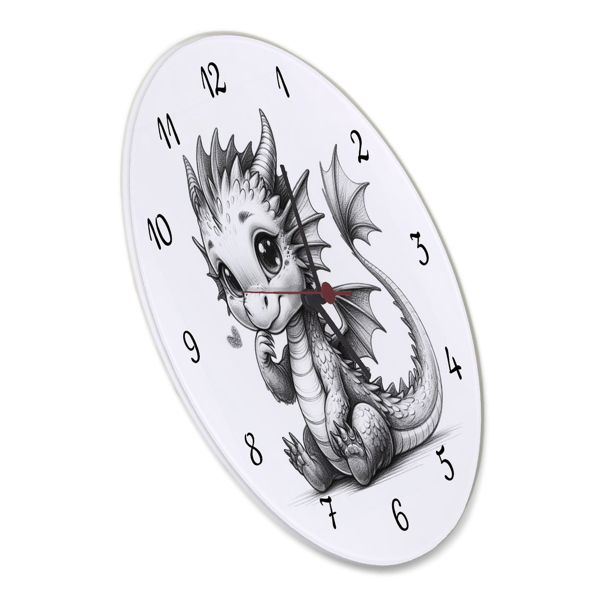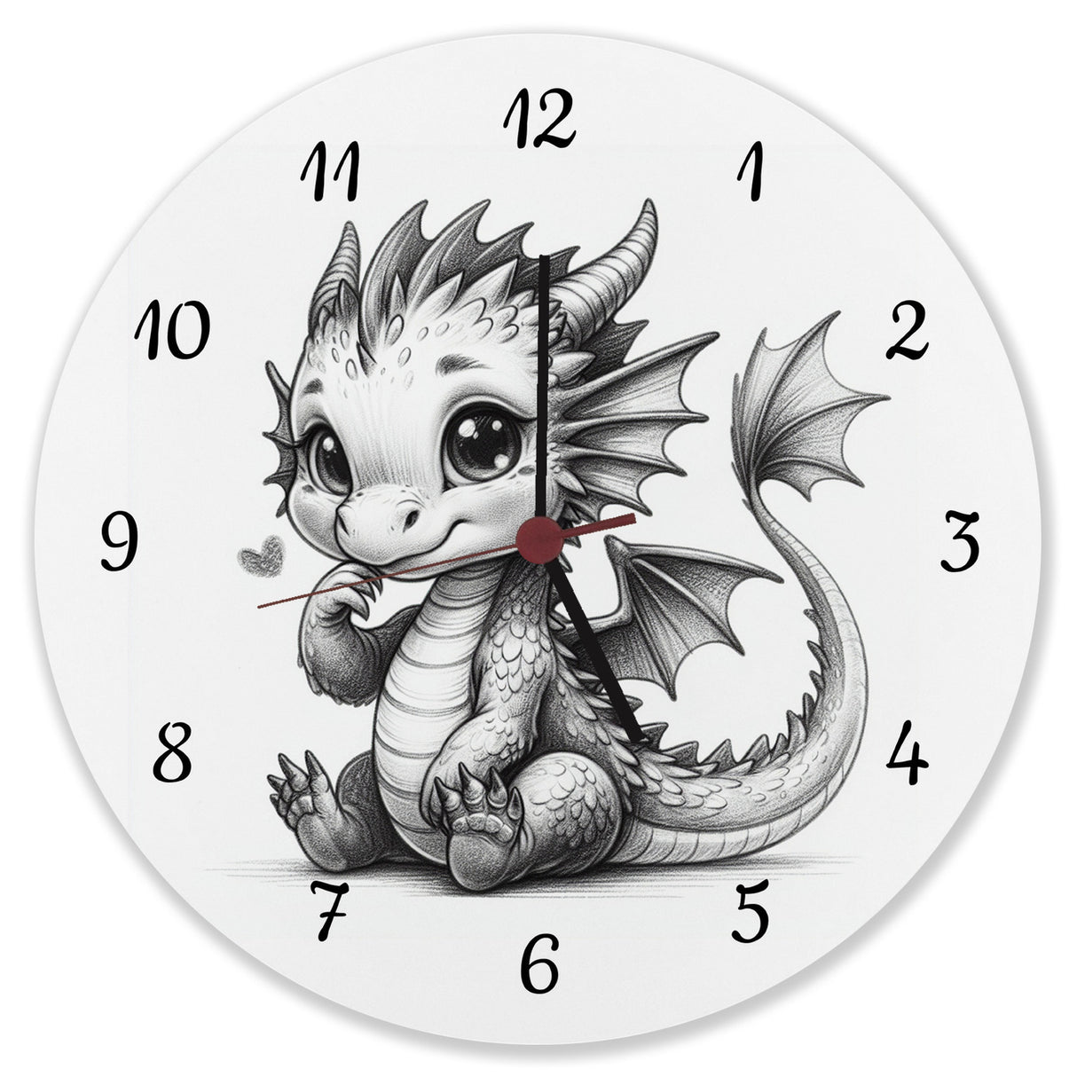Aufgepasst und Ohren gespitzt! Diese niedliche Deko tickt nicht nur, sie verzaubert! Die bezaubernde Kreatur Wanduhr ist das Tüpfelchen auf dem i für Abenteurerträume. Ein sitzender Drache, der freundlich grinst – wer hätte gedacht, dass Zeitmessen so entzückend sein kann?Tick-tock, schaut mal, wer da kuckt! Unsere niedlicher Babydrache Wanduhr bringt mit großen Kulleraugen und einem Lächeln die Zeit näher. Dieser süße Wächter der Sekunden ist nicht nur pünktlich, sondern auch unwiderstehlich charmant – ein märchenhaftes Highlight für jedes Kinderzimmer!Erhältlich in den Varianten 26,5 cm (MDF), 28 cm (Alu-Verbund) oder 30 cm (Glas). Hast du jemals mit der Zeit geflirtet? Nun, das ist deine Chance! Mach dich bereit, in ein magisches Abenteuer einzutauchen, jedes Mal, wenn du einen Blick auf den niedlichen Babydrache an deiner Wand wirfst. Dieses charmante Geschöpf ist nicht nur ein Wächter der vergangenen Minuten, sondern auch ein Meister der Erheiterung. Mit seinem umwerfenden Lächeln wird unser freundlicher Drache jeden Raum in ein Märchenland verwandeln.Ideal für die kleinen Abenteurer und Fantasie-Liebhaber in deinem Leben, ist diese Wanduhr das perfekte Geschenk für jede Gelegenheit. Die Kleinen können den Drachen als Inspiration nutzen, um heldenhafte Schlachten gegen die Zeit zu kämpfen oder einfach nur die Minuten bis zur Schlafenszeit zählen. Mit einem Blick auf diesen sitzenden Schöngeist werden sie immer wissen, wann es Zeit für das nächste große Abenteuer ist. Stell dir die Freude deiner Liebsten vor, wenn sie dieses bezaubernde Geschöpf auspacken. Eingepackt in ein wenig Mystik und einer Prise Humor, ist diese Wanduhr nicht nur funktional, sondern auch ein echter Blickfang. Sie vereint spielerisch den Charme einer Märchenwelt mit der Praktikabilität des Alltags. Verpasse nicht die Chance, ein wenig Zauber in das Leben deiner Familie oder Freunde zu bringen – mit der niedlichen Babydrache Wanduhr, dem Zeithüter, den selbst Feen beneiden würden.