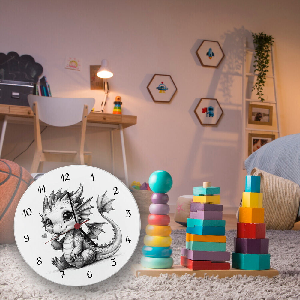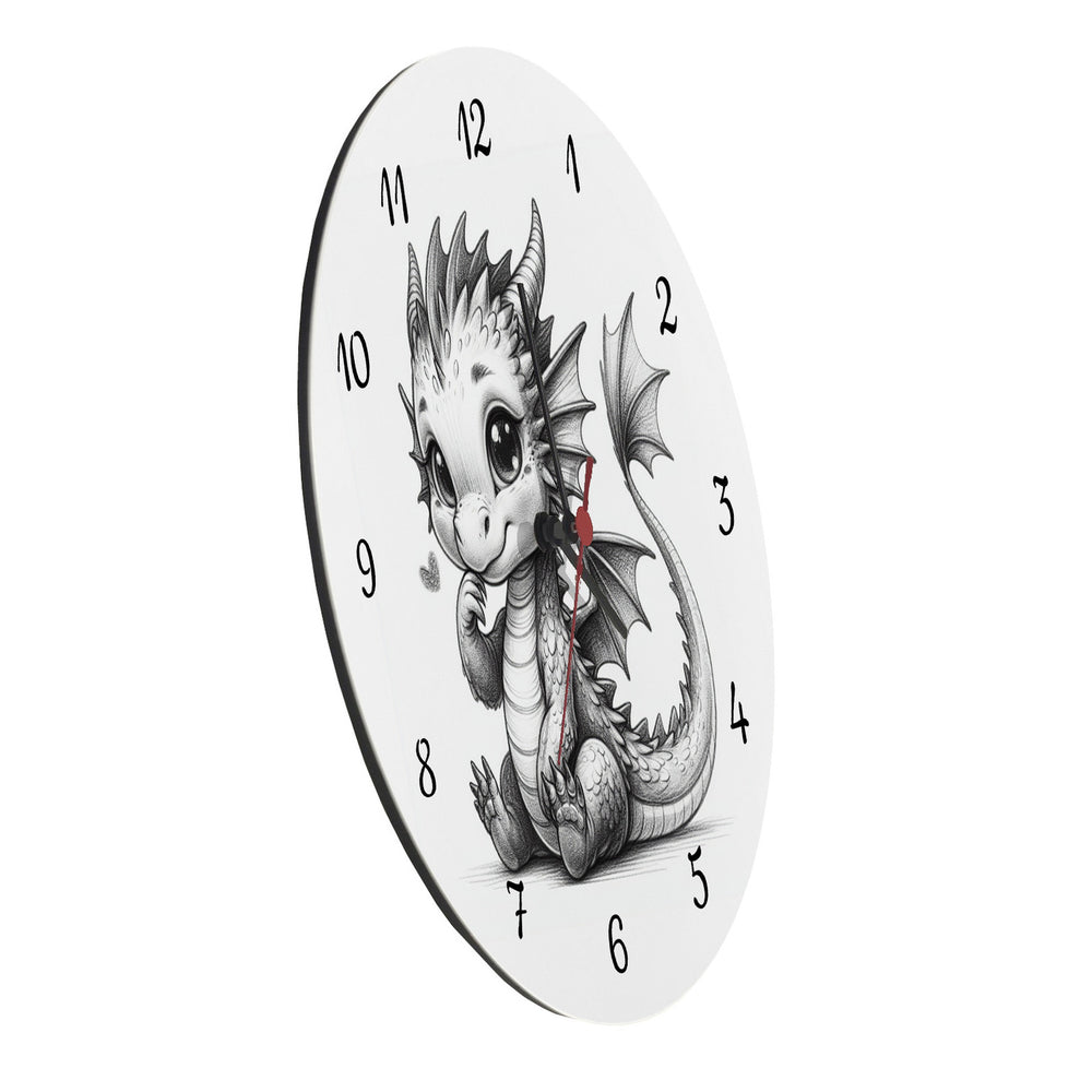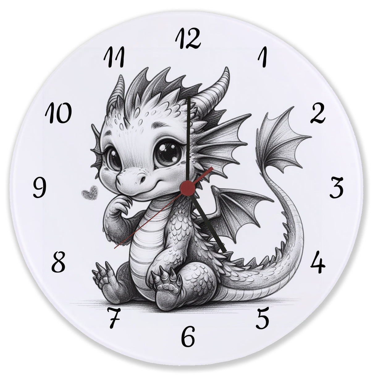 Aufgepasst und Ohren gespitzt! Diese niedliche Deko tickt nicht nur, sie verzaubert! Die bezaubernde Kreatur Wanduhr ist das Tüpfelchen auf dem i für Abenteurerträume. Ein sitzender Drache, der freundlich grinst – wer hätte gedacht, dass Zeitmessen so entzückend sein kann?Tick-tock, schaut mal, wer da kuckt! Unsere niedlicher Babydrache Wanduhr bringt mit großen Kulleraugen und einem Lächeln die Zeit näher. Dieser süße Wächter der Sekunden ist nicht nur pünktlich, sondern auch unwiderstehlich charmant – ein märchenhaftes Highlight für jedes Kinderzimmer!Erhältlich in den Varianten 26,5 cm (MDF), 28 cm (Alu-Verbund) oder 30 cm (Glas). Hast du jemals mit der Zeit geflirtet? Nun, das ist deine Chance! Mach dich bereit, in ein magisches Abenteuer einzutauchen, jedes Mal, wenn du einen Blick auf den niedlichen Babydrache an deiner Wand wirfst. Dieses charmante Geschöpf ist nicht nur ein Wächter der vergangenen Minuten, sondern auch ein Meister der Erheiterung. Mit seinem umwerfenden Lächeln wird unser freundlicher Drache jeden Raum in ein Märchenland verwandeln.Ideal für die kleinen Abenteurer und Fantasie-Liebhaber in deinem Leben, ist diese Wanduhr das perfekte Geschenk für jede Gelegenheit. Die Kleinen können den Drachen als Inspiration nutzen, um heldenhafte Schlachten gegen die Zeit zu kämpfen oder einfach nur die Minuten bis zur Schlafenszeit zählen. Mit einem Blick auf diesen sitzenden Schöngeist werden sie immer wissen, wann es Zeit für das nächste große Abenteuer ist. Stell dir die Freude deiner Liebsten vor, wenn sie dieses bezaubernde Geschöpf auspacken. Eingepackt in ein wenig Mystik und einer Prise Humor, ist diese Wanduhr nicht nur funktional, sondern auch ein echter Blickfang. Sie vereint spielerisch den Charme einer Märchenwelt mit der Praktikabilität des Alltags. Verpasse nicht die Chance, ein wenig Zauber in das Leben deiner Familie oder Freunde zu bringen – mit der niedlichen Babydrache Wanduhr, dem Zeithüter, den selbst Feen beneiden würden.