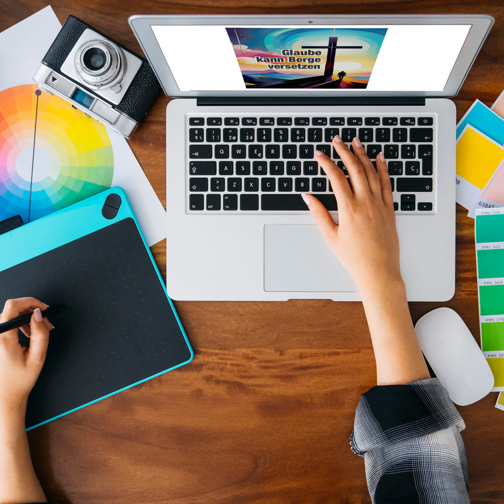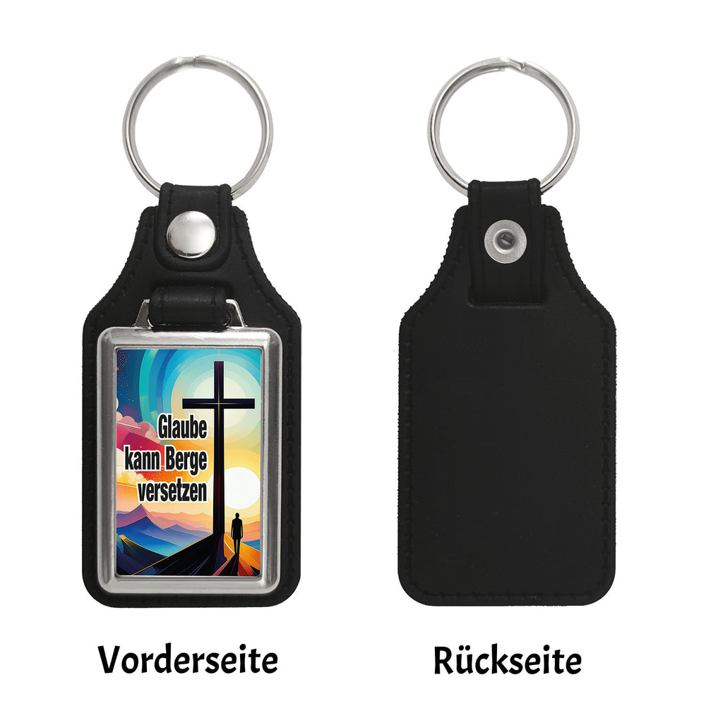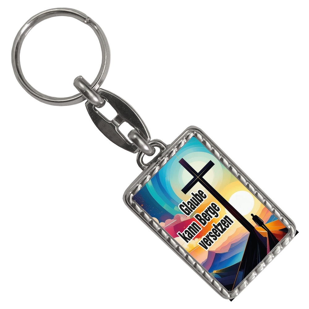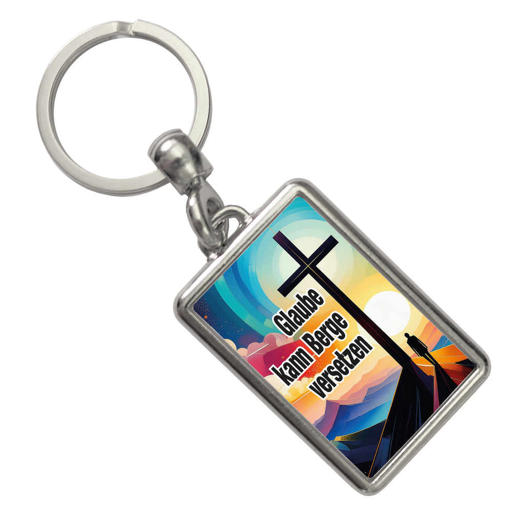 - Der Schlüsselanhänger zeigt ein kreatives Bergmotiv mit einem Kreuz und einem Menschen, der in einer stilisierten Bergwelt steht. Der inspirierende Spruch „Glaube kann Berge versetzen“ ziert das Design. Ein einzigartiger Eyecatcher, der Spiritualität und Liebe zur Natur vereint.