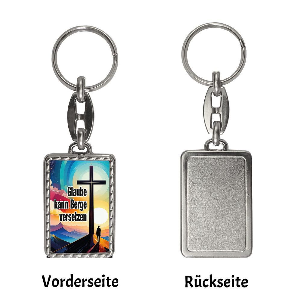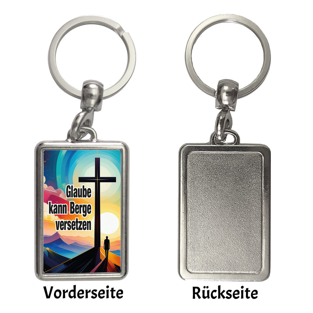 - 1x Berg mit Kreuz Schlüsselanhänger mit Spruch: Glaube kann Berge versetzen in der gewählten Ausführung