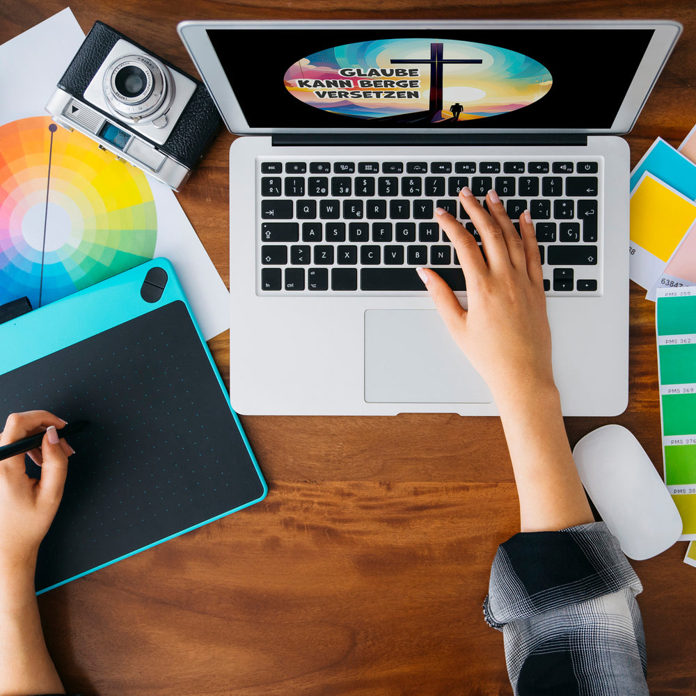 - Diese inspirierende Tasse in edlem Schwarz zeigt ein kraftvolles Motiv: Ein Mensch steht ehrfurchtsvoll vor einem Kreuz, eingebettet in eine abstrakte Berglandschaft. Der eingravierte Spruch "Glaube kann Berge versetzen" erinnert täglich an die Stärke des Glaubens. Ein echter Hingucker auf jedem Tisch!