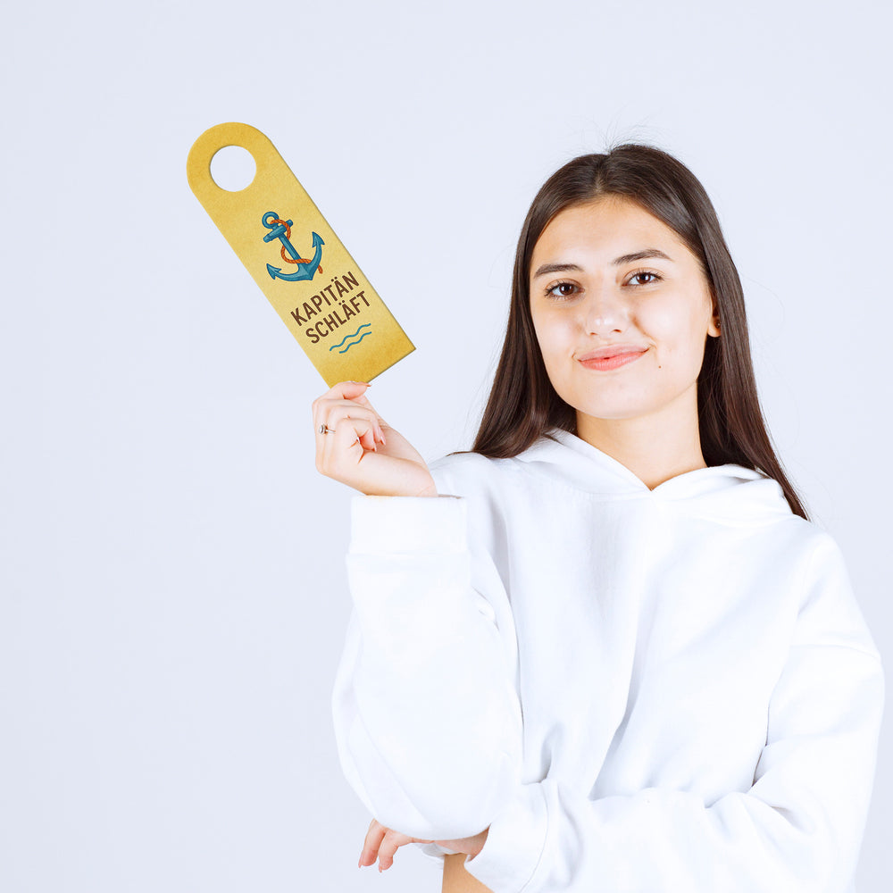 - Dieser Türhänger ist ein maritimes Highlight! Mit einem blauen Anker auf gelbem Hintergrund und einem Segelboot auf hellblauem Hintergrund, wird der nautische Traum wahr. Der Vintage-Stil und der Spruch "Kapitän schläft, Kajüte frei" in frecher Schrift machen ihn zu einem echten Hingucker.