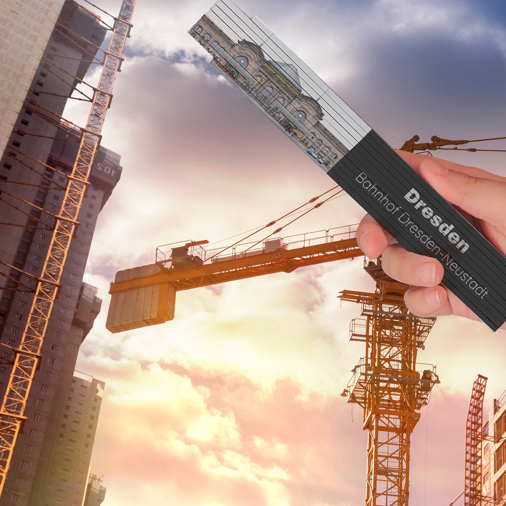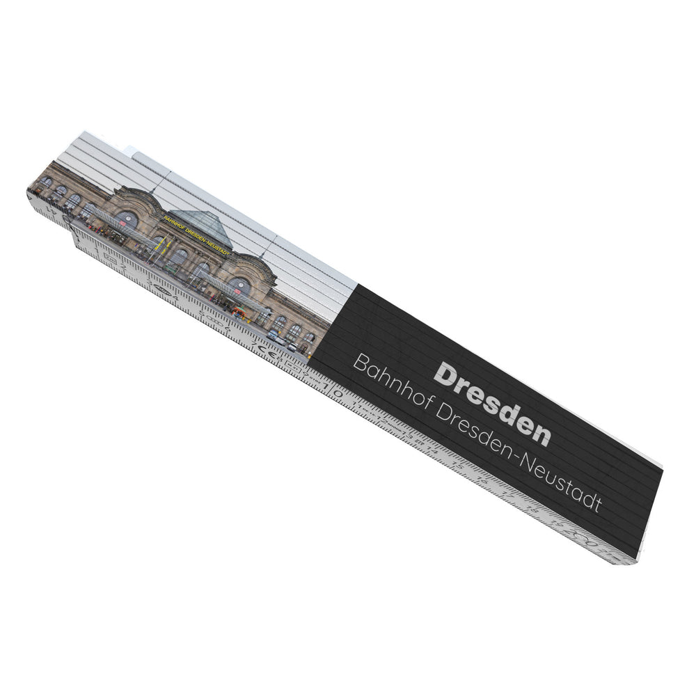 • Die Kombination des beeindruckenden Bahnhofs Dresden-Neustadt mit einem Meterstab macht aus diesem Gegenstand ein faszinierendes und funktionales Sammlerstück. Ein unverwechselbares Accessoire, das sowohl im Handwerksbereich als auch als dekoratives Element die elegante Ästhetik und den praktischen Nutzen vereint.