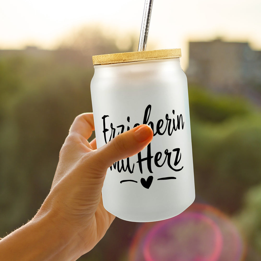 - 1x Erzieherin mit Herz Trinkglas mit Bambusdeckel für Pädagogen mit Bambusdeckel oder Henkel