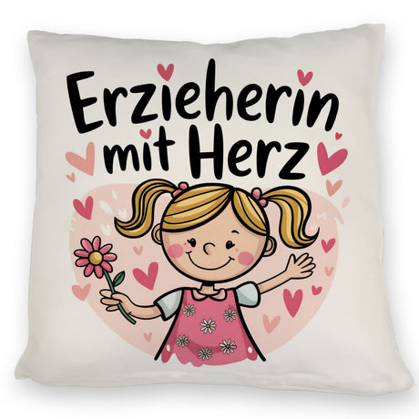 Fröhliche Cartoon-Figur - Erzieherin mit Herz Kissen