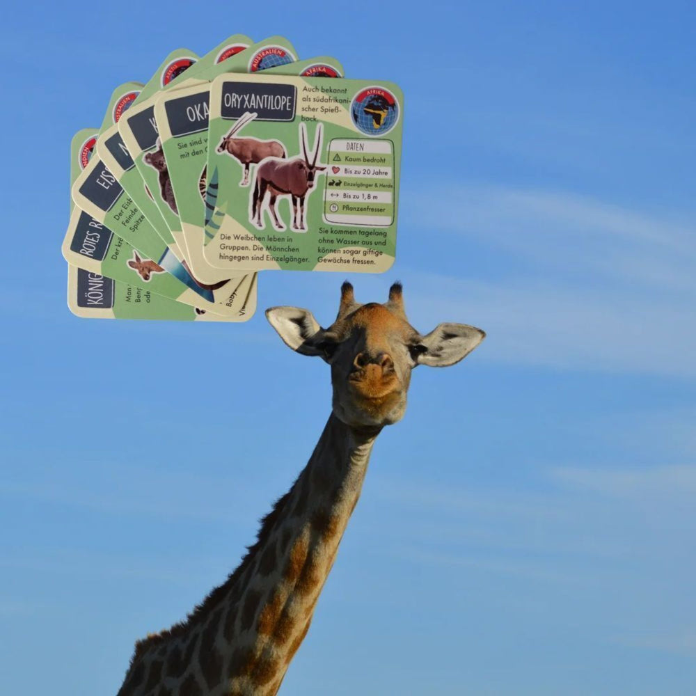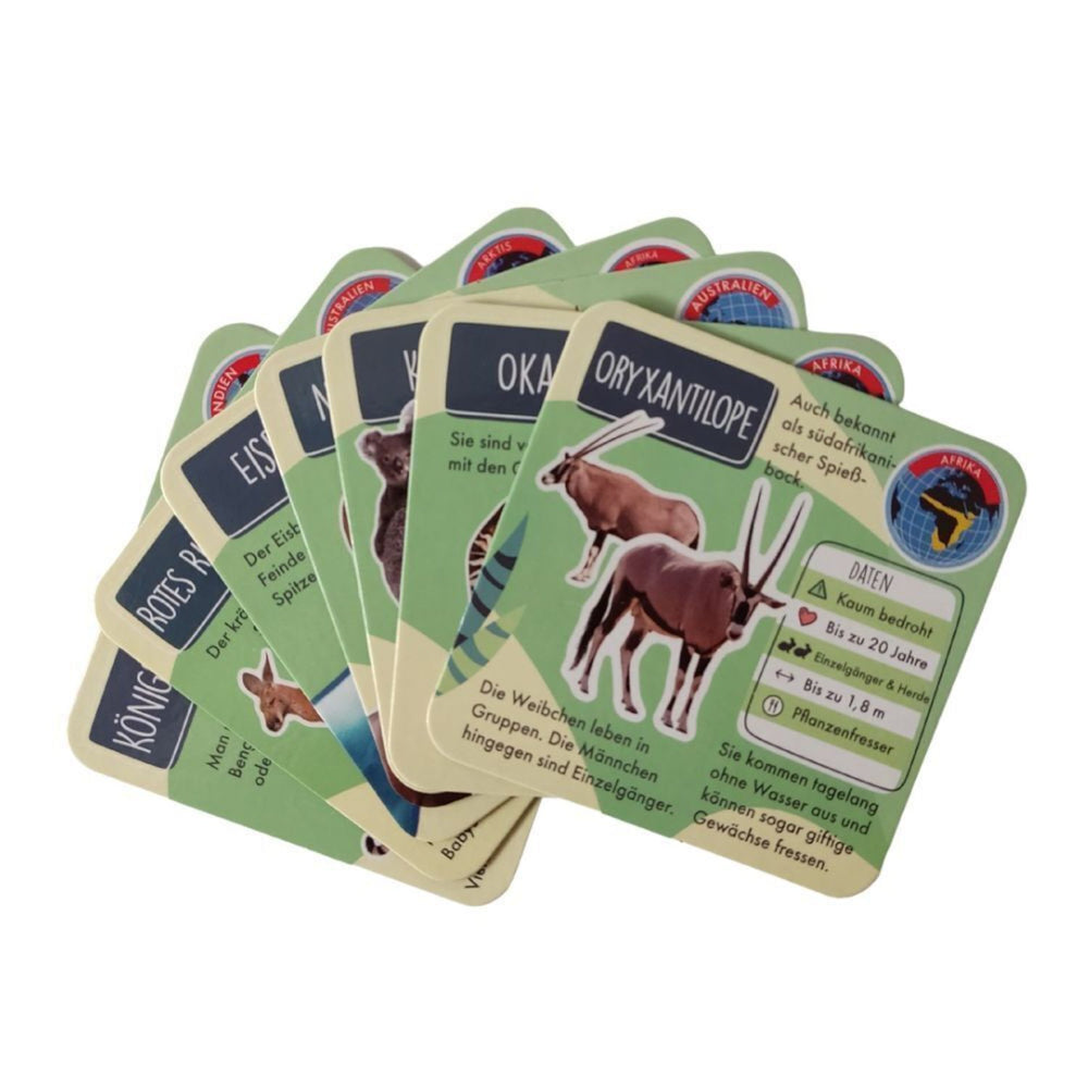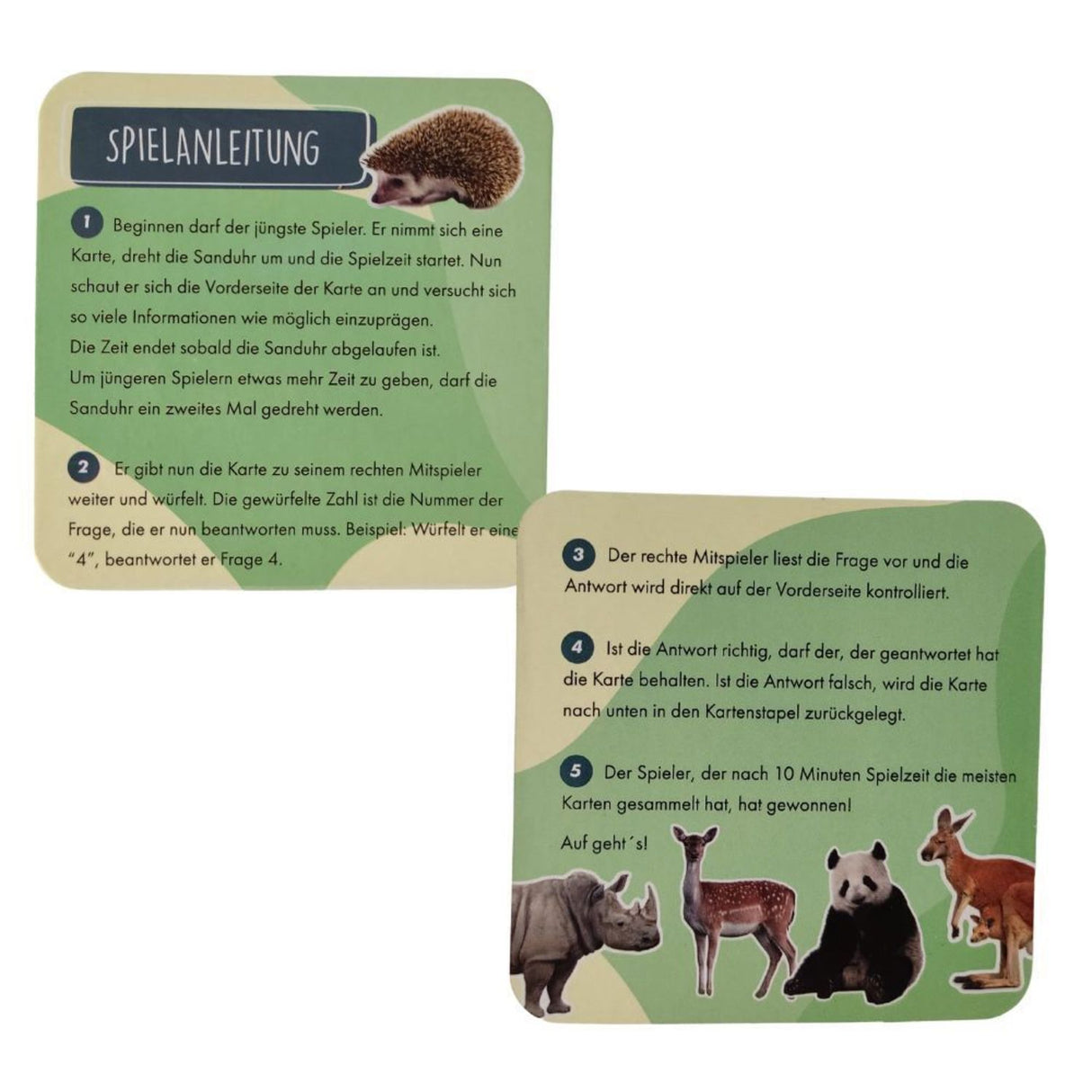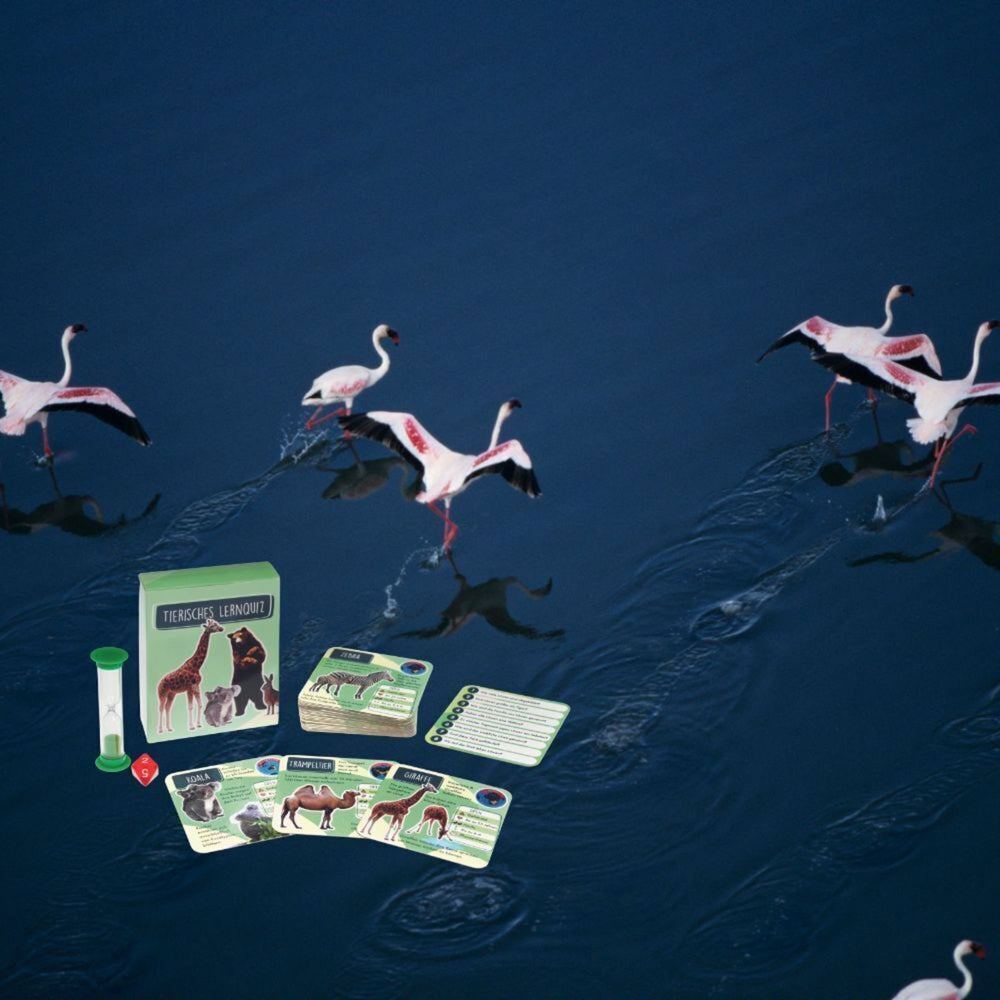 - Lieferumfang: 1x Tierisches Lernquiz Gesellschaftsspiel bestehend aus 26x Spielkarten, 1x Sanduhr und 1x Würfel mit 8 Seiten. Ebenso liegt eine Bedienungsanleitung in deutscher Sprache bei.