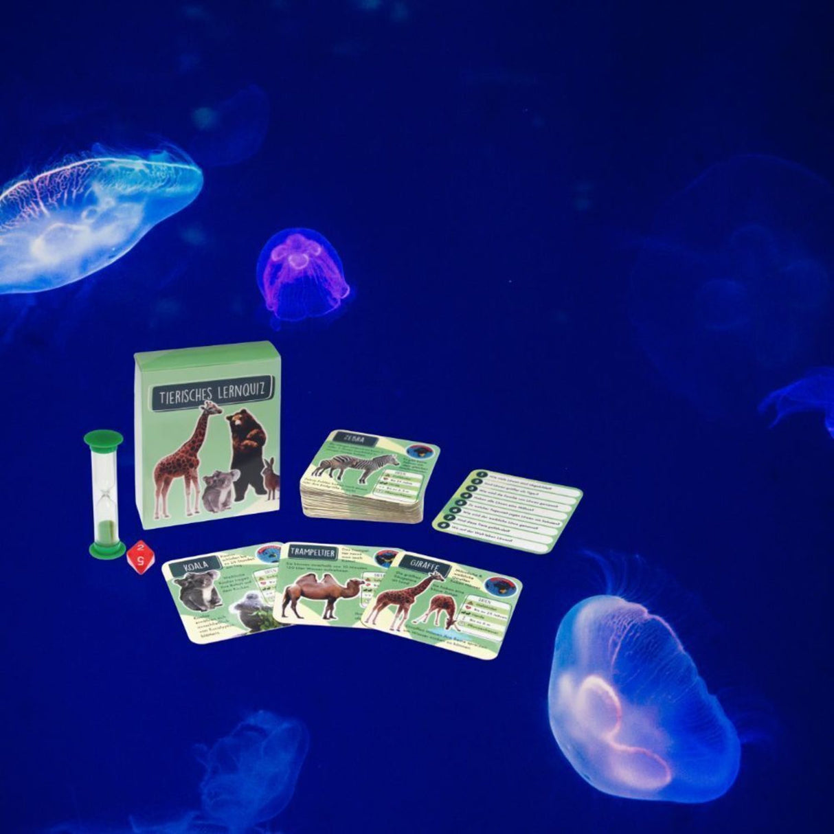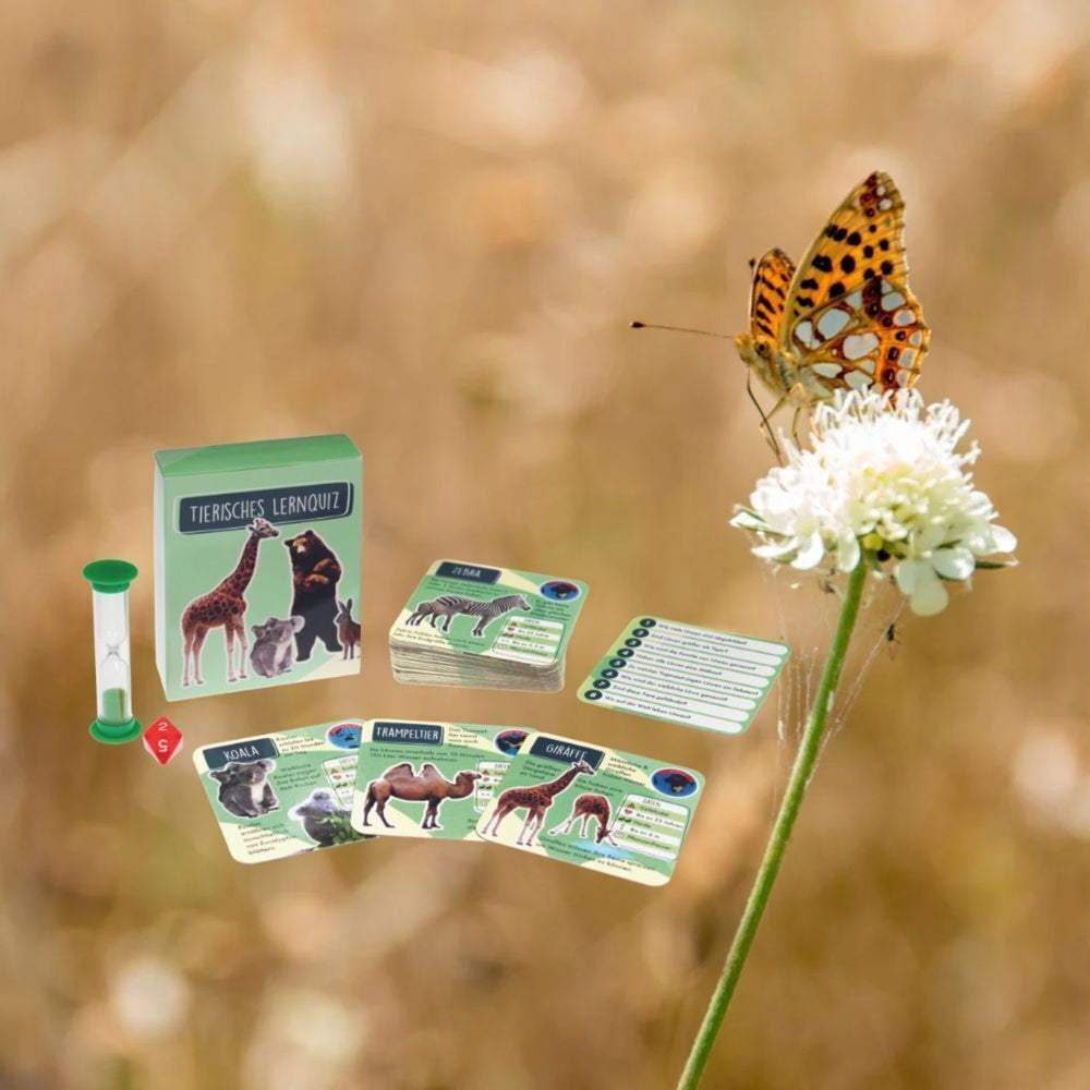 Tierisches Lernquiz Gesellschaftsspiel mit Sanduhr und Würfel