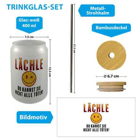 - Emoticon Trinkglas mit Bambusdeckel mit Spruch Lächle du kannst sie nicht alle töten €14,95Grundpreis /Nicht verfügbarAuf Lager