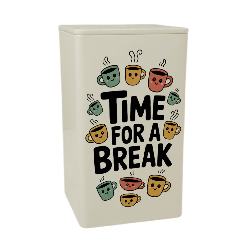 - Diese lustige Vorratsdose zeigt eine verspielte Cartoon-Illustration von Miniatur-Kaffeetassen und Teetassen in fröhlichen Farben wie Mintgrün, Sonnengelb und Korallenrosa. Der zentrale Text "Time for a break" ist in freundlichen, abgerundeten Buchstaben geschrieben. Die Tassen haben niedliche Gesichtsausdrücke mit Punktaugen und kleinen Lächeln.