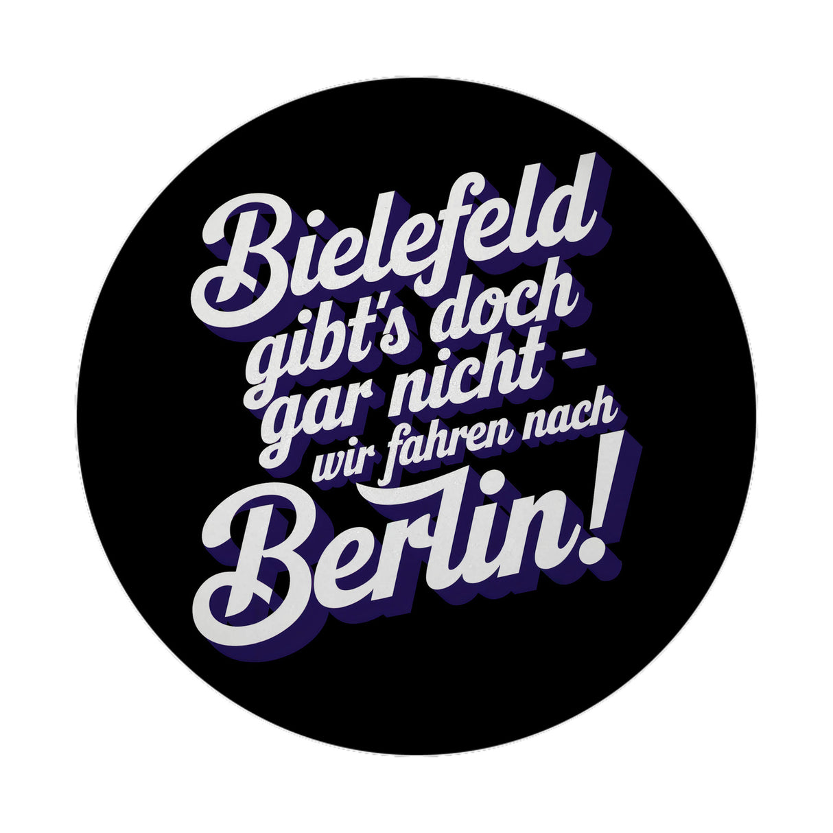 - Dieser runde Magnet bringt mit seinem frechen Spruch "BIELEFELD gibt's doch gar nicht - wir fahren nach BERLIN!" jede Menge Spaß an deinen Kühlschrank. Der schwarze Hintergrund mit weißem, geschwungenem Text, königsblauem Schatten und einer Prise Ostwestfalen-Stolz wird zum Hingucker in deiner Küche!