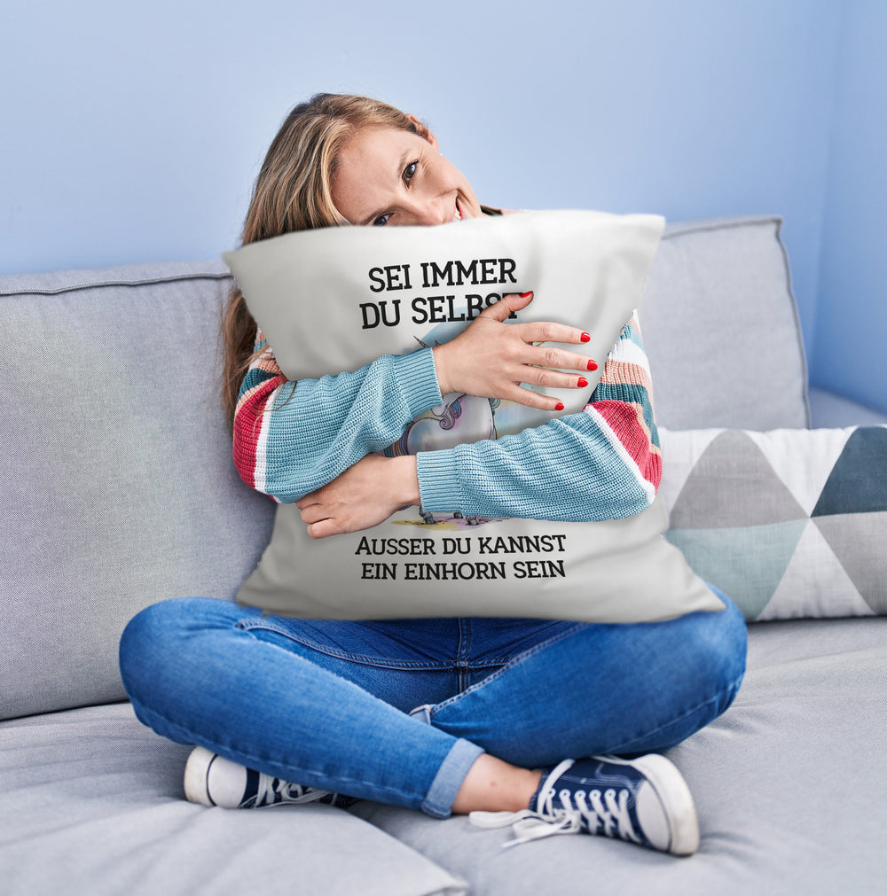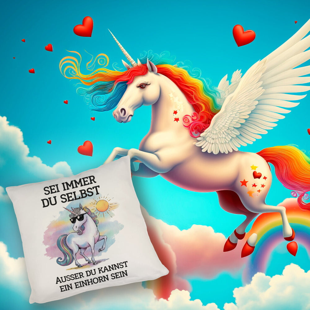 - Dieses einzigartige Kissen zeigt ein cooles Einhorn mit Sonnenbrille, das selbstbewusst unter einer strahlenden Sonne steht. Mit Pastellfarben und einem motivierenden Spruch "Sei immer du selbst, außer du kannst ein Einhorn sein" auf einem pastellfarbenen Himmel, versprüht es pure Coolness und Stil.