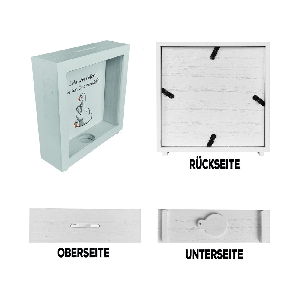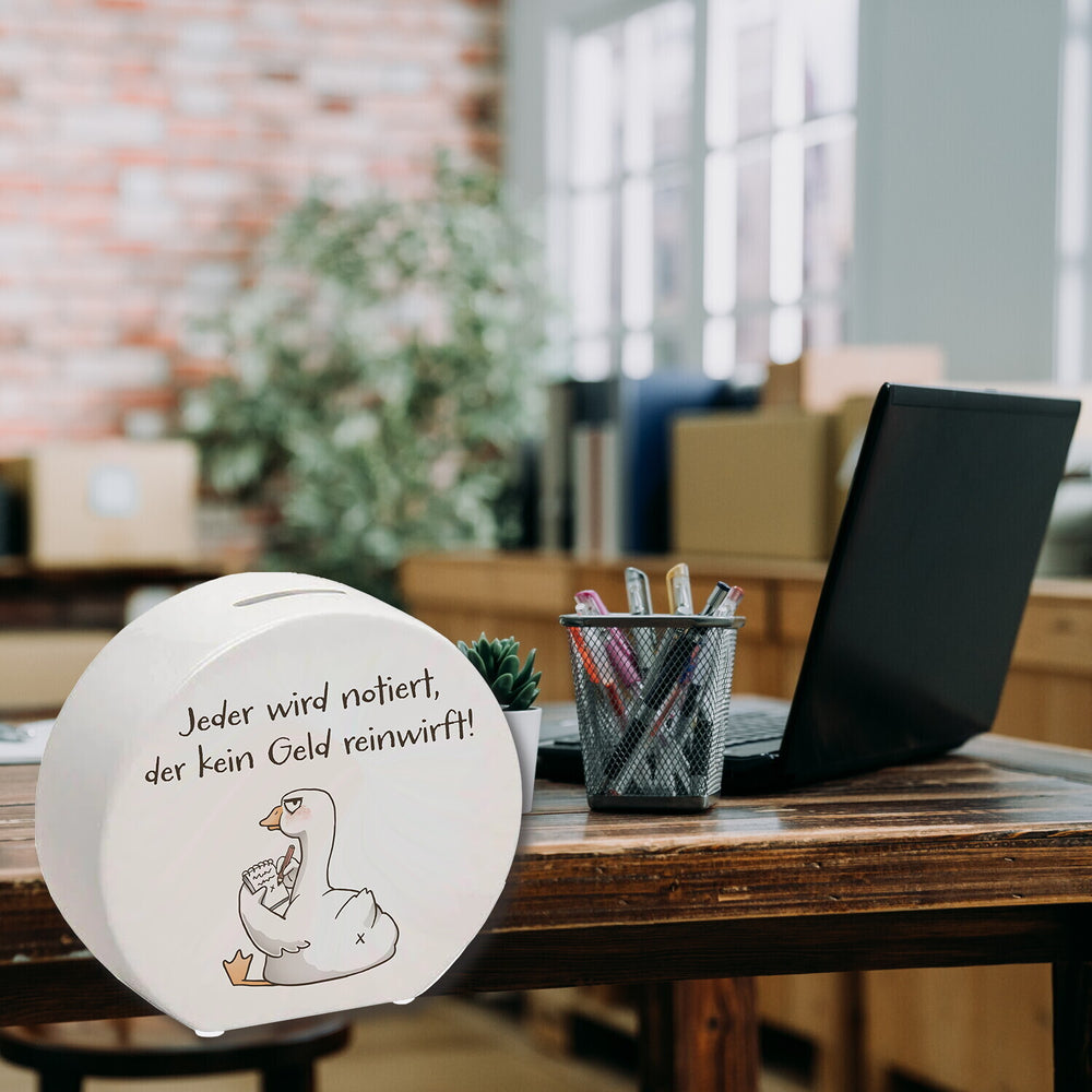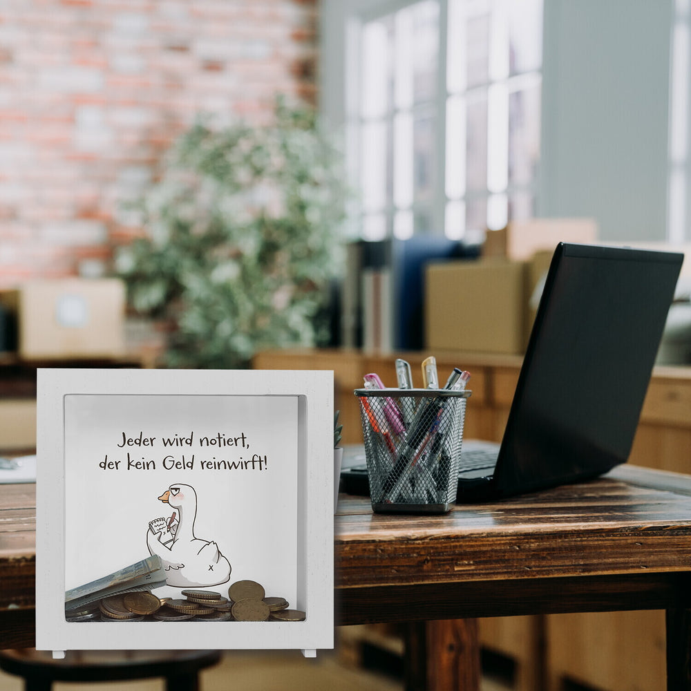 Machen Sie sich bereit für Gilbert, die Spardosen-Gans, die nicht nur Ihr Kleingeld, sondern auch Ihr Herz bewacht! Gilbert die Gans ist die perfekte Mischung aus Witz, Cartoons und Nerd-Charm und bringt sofort Freude in jede Umgebung. Mit dem frechen Spruch „Jeder wird notiert, der kein Geld reinwirft!“ sorgt Gilbert für Lacher und motiviert zugleich zum Sparen.Ob auf dem Schreibtisch im Büro, im Arbeitszimmer oder zu Hause – Gilbert ist ein absoluter Blickfang! Erhältlich in drei verschiedenen Ausführungen – als schlichte Holzspardose, edle ovale Keramik-Version oder exklusive Holzrahmen-Variante mit Sichtfenster – passt Gilbert perfekt zu jeder Einrichtung und jedem Anlass. Alle Ausführungen werden mit viel Liebe und Sorgfalt in unserer Spardosen-Manufaktur in Deutschland bedruckt.Für Kollegen, Chefs oder Freunde ist Gilbert die ideale Geschenkidee. Er bringt nicht nur ein Lächeln ins Gesicht, sondern sorgt auch dafür, dass das Kleingeld in der Spardose schneller wächst. Kein Miesepeter kommt an der Liste von Gilbert vorbei!Ob als Geschenk für Geburtstage, Büroeinweihungen oder einfach als humorvolles Accessoire für zwischendurch – Gilbert die Gans sorgt garantiert für Gesprächsstoff und eine ordentliche Portion Spaß. Holen Sie sich Gilbert und lassen Sie ihn heimlich Notizen über alle machen, die ihr Geld nicht einwerfen!