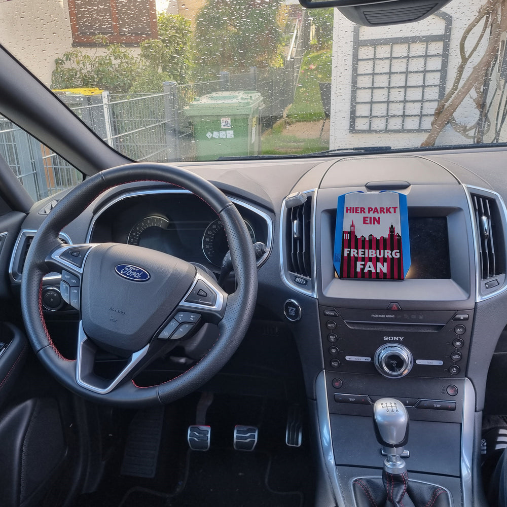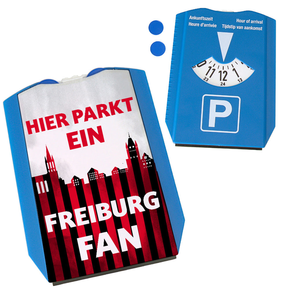 Hier parkt ein Freiburg Fan Parkscheibe in Vereinsfarben