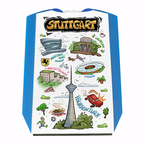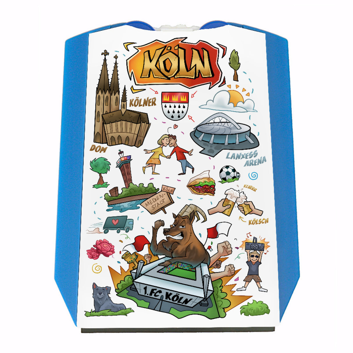 - Diese Parkscheibe präsentiert ein buntes Köln-Wimmelbild im Comicstil. Sie fängt die Essenz von Köln mit ikonischen Wahrzeichen wie dem Kölner Dom, der Lanxess Arena und typischen Brauhäusern ein. Durch die lebendigen Farben und kreativen Illustrationen wird das alltägliche Parken zu einem unterhaltsamen Erlebnis.