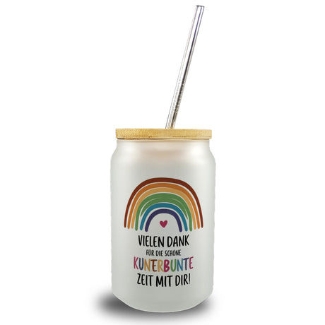 Vielen Dank für die kunterbunte Zeit Trinkglas mit Bambusdeckel mit Regenbogen