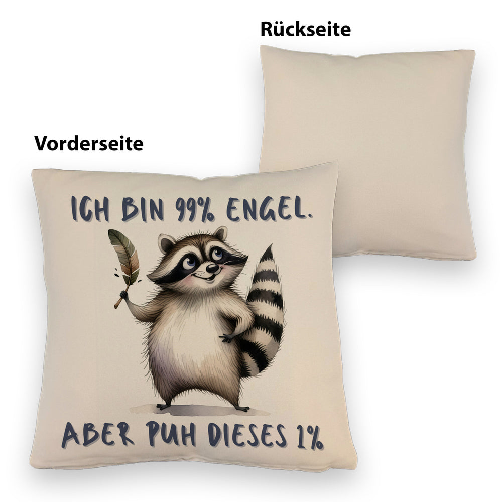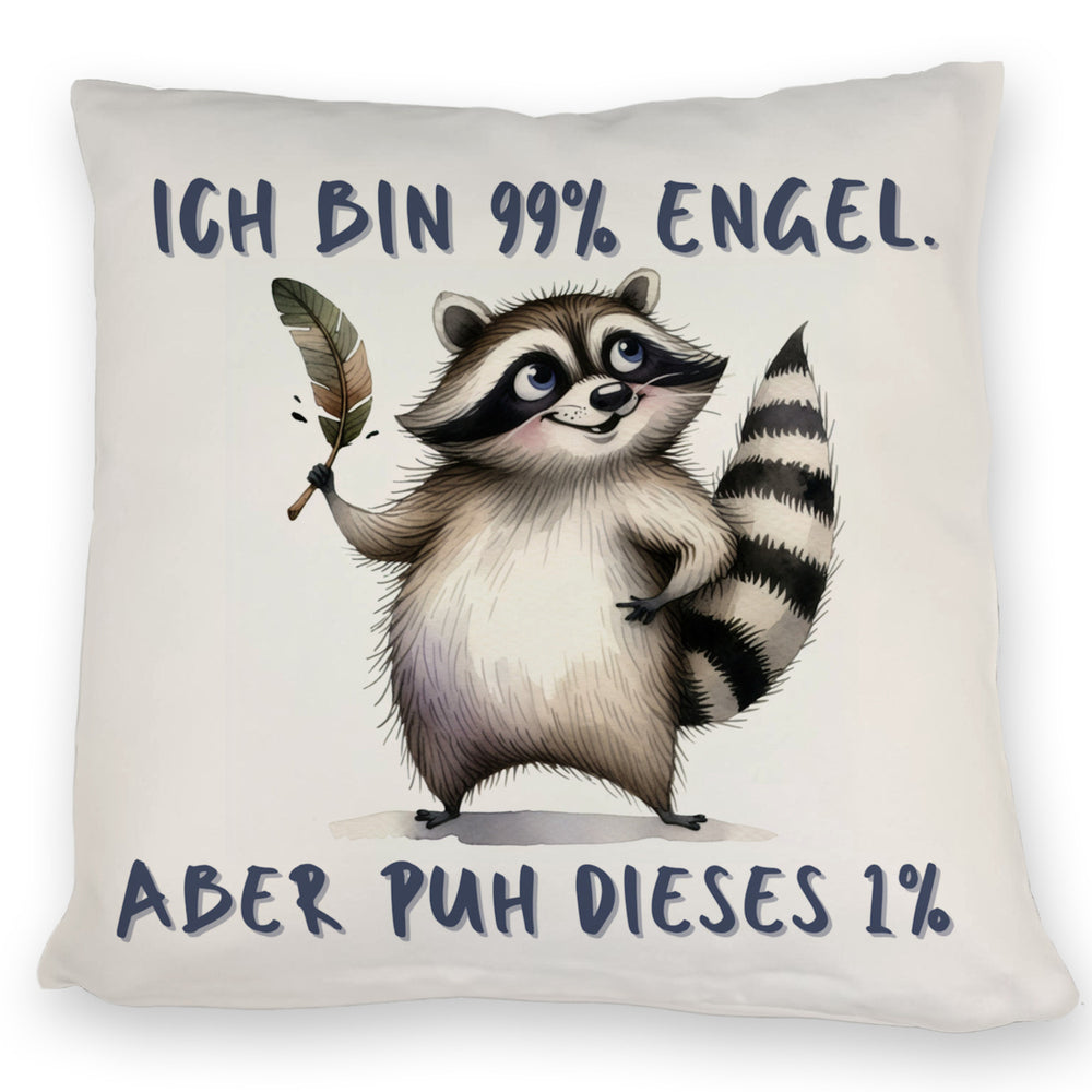 - 1x Waschbär Kissen mit Spruch Ich bin 99% Engel Aber puh dieses 1% in der gewählten Ausführung