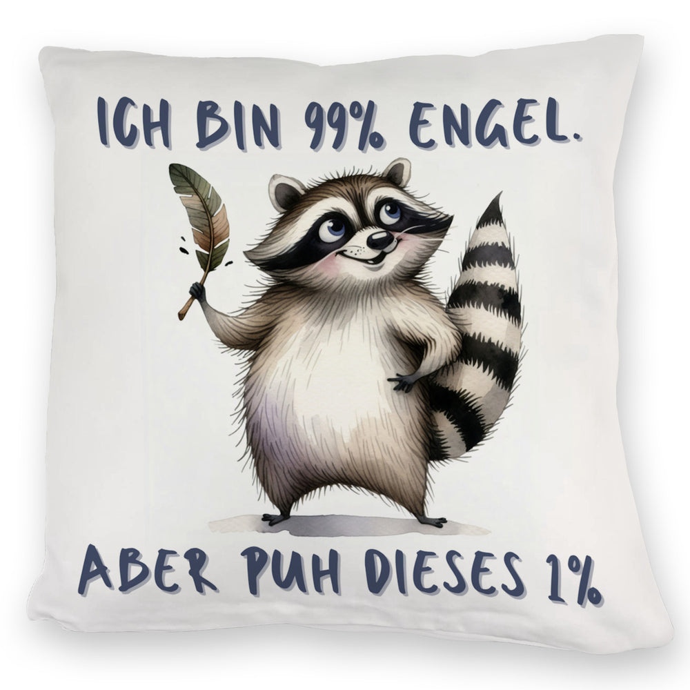 Waschbär Kissen mit Spruch Ich bin 99% Engel Aber puh dieses 1%