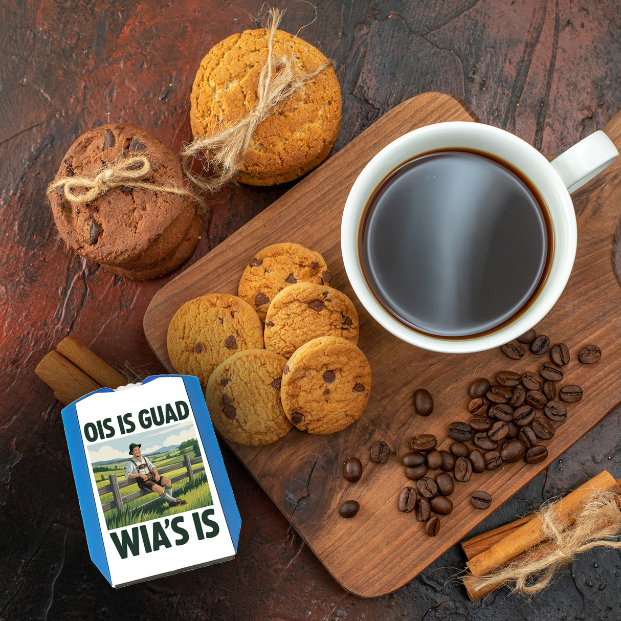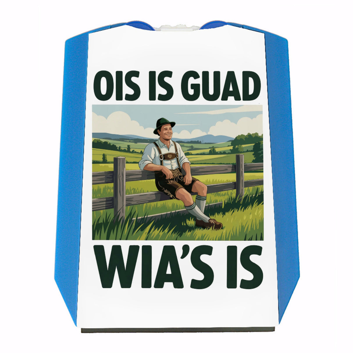 - Diese Parkscheibe begeistert durch ihr charmantes Design: Ein entspannter Bauer lehnt sich lächelnd an einen Holzzaun und blickt auf seine malerischen Felder. Er trägt traditionelle bayerische Kleidung: ein weißes Hemd, braune Lederhosen und einen grünen Hut. Der bayerische Spruch "Ois is guad, wia's is" vervollständigt das humorvolle Erscheinungsbild.
